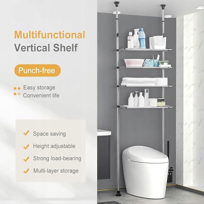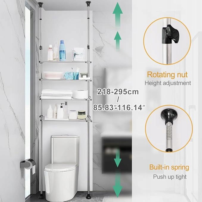 BAOYOUNI 4-poziomowa rozszerzalna półka na pranie nad toaletą pralko-suszarka stojak do przechowywania od podłogi do sufitu organizer łazienkowy oszczędzający miejsce drążek napinający do małych