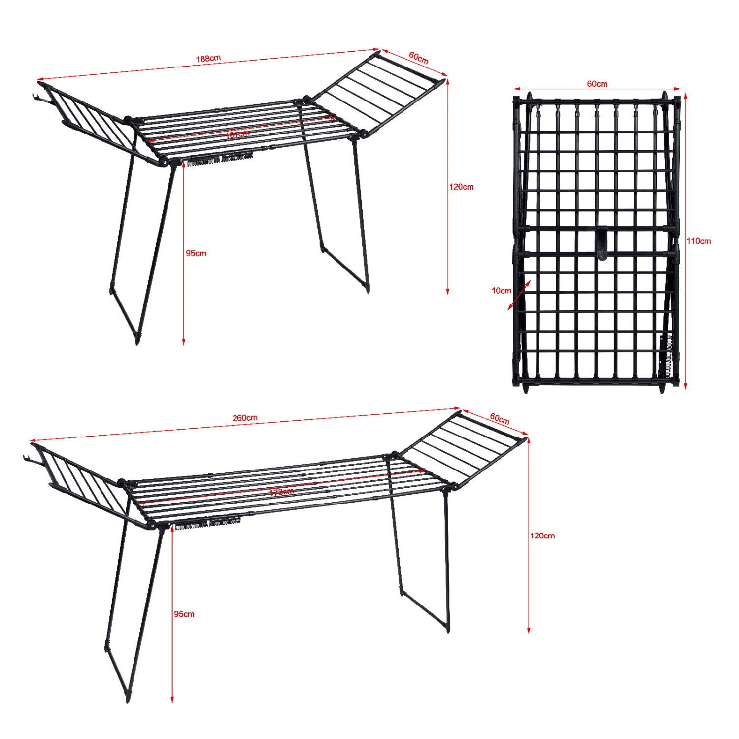 Dzięki przemyślanej konstrukcji, suszarkę można szybko złożyć, a jej kompaktowe rozmiary po złożeniu (60x10x110 cm) pozwolą na łatwe przechowywanie w wąskich przestrzeniach, takich jak szafy, schowki czy wnęki. To sprawia, że idealnie nadaje się do mniejszych mieszkań, łazienek czy balkonów, nie zajmując cennej przestrzeni, gdy nie jest używana.
