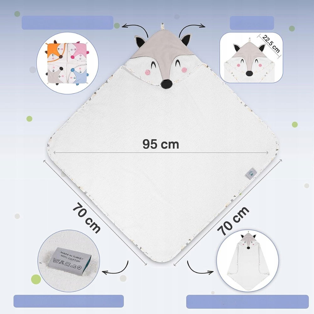 Wzór Fox Head w subtelnym, szarym kolorze łączy estetykę i funkcjonalność, czyniąc kąpiel jeszcze przyjemniejszą zarówno dla dziecka, jak i rodziców.