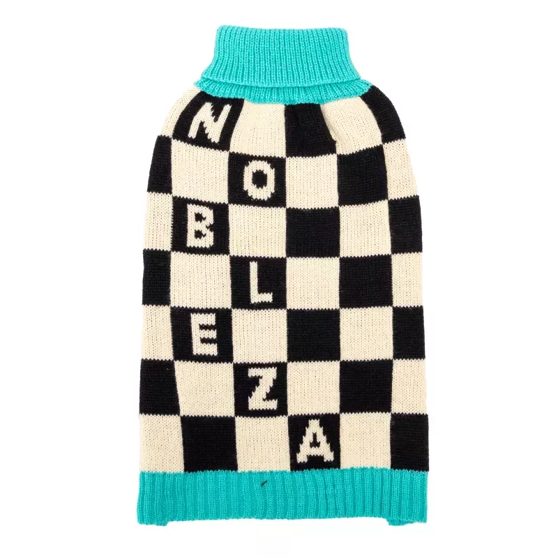 Elegancji, klasyczny cieplutki sweterek z kontrastowym żakardowym kraciastym wzorem, dla psich zmarzluchów. Idealne ubranko na chłodniejsze dni, jest milutkie, rozciągliwe, dzięki czemu nie będzie problemu, aby założyć go na pieska.