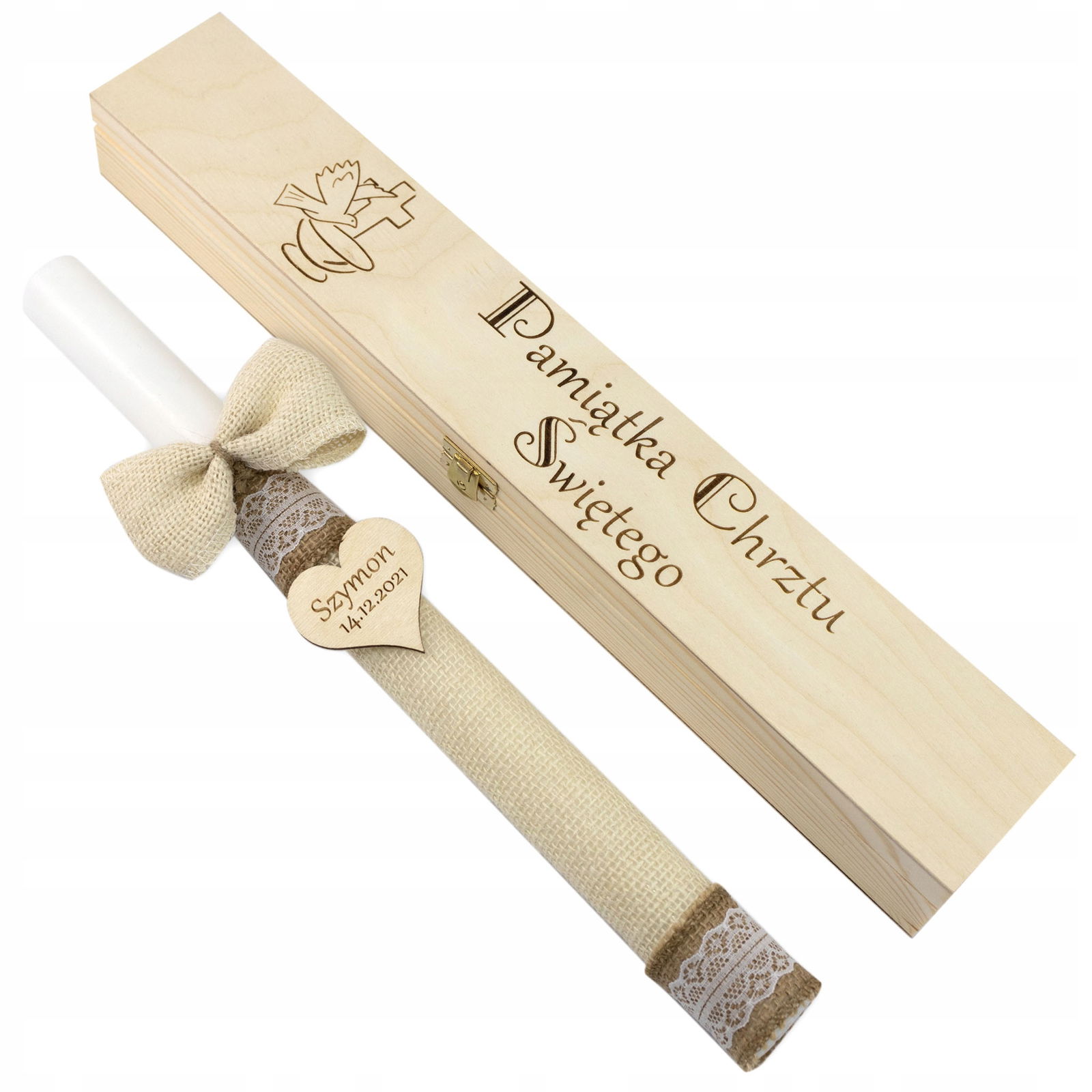 Świeczka na chrzest w stylu rustykalnym zawinięta w jutę z koronkowymi wstążkami, piękną kokardką oraz drewnianym serduszkiem z wygrawerowanym imieniem oraz datą, zapakowaną w drewnianym pudełku z grawerem.
