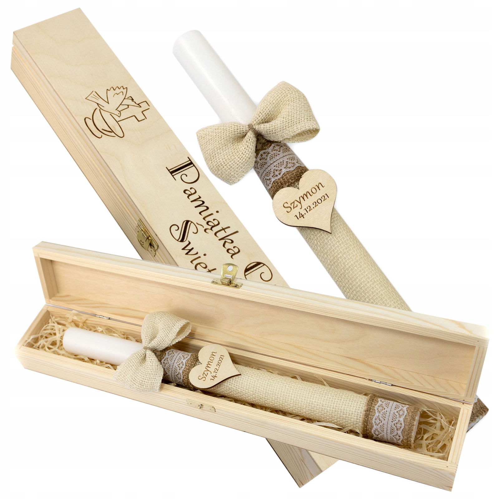 Świeczka na chrzest w stylu rustykalnym zawinięta w jutę z koronkowymi wstążkami, piękną kokardką oraz drewnianym serduszkiem z wygrawerowanym imieniem oraz datą, zapakowaną w drewnianym pudełku z grawerem.