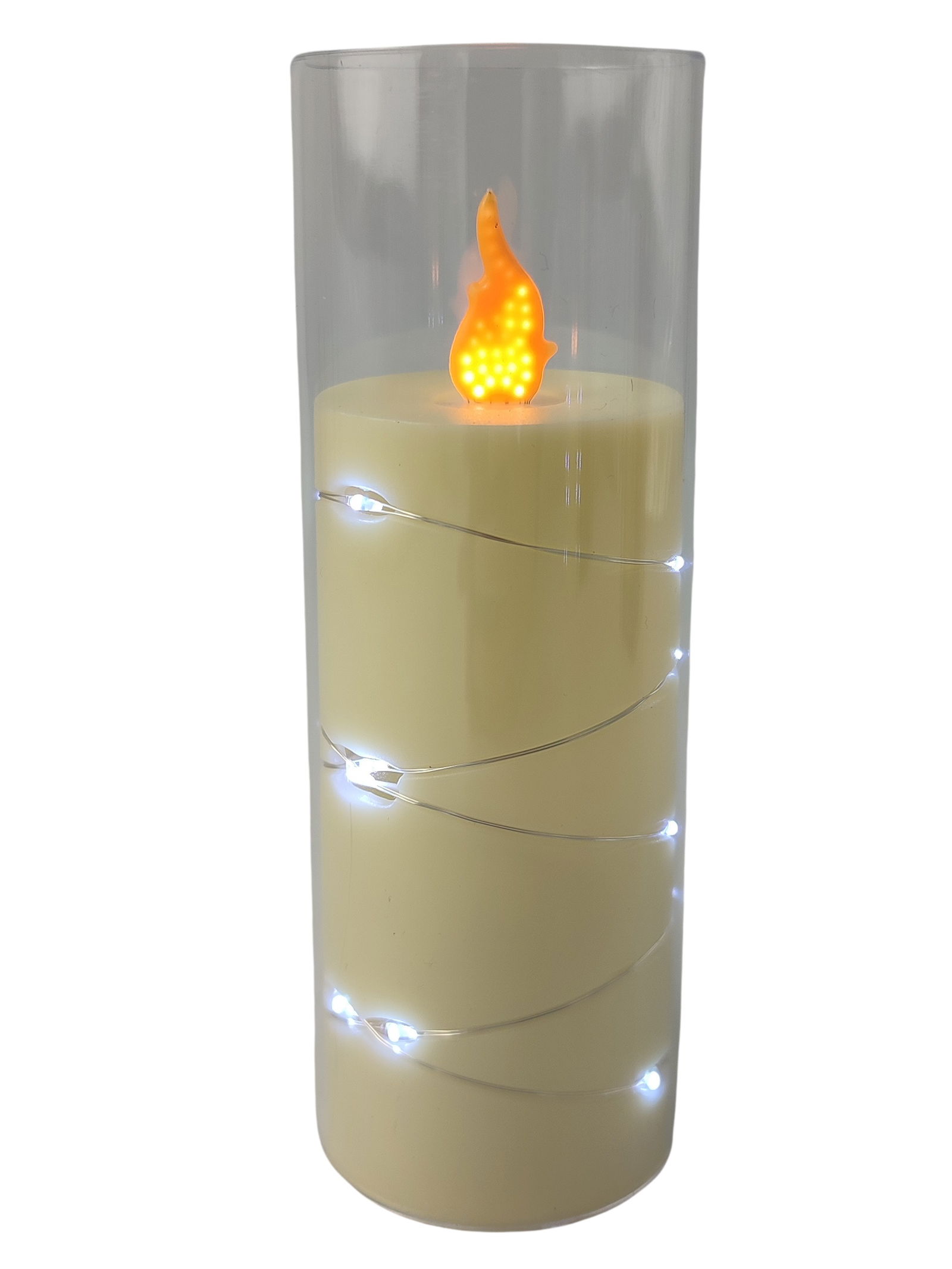 Kremowa świeca LED opleciona łańcuszkiem z zimnobiałych diod tworzy elegancki i nowoczesny efekt świetlny, który subtelnie podkreśla jej wyjątkowy charakter. Dodatkowym atutem jest knot z realistycznym efektem migotania, który wiernie imituje płomień prawdziwej świecy, nadając całości jeszcze bardziej naturalny wygląd. Idealnie sprawdzi się jako dekoracja nagrobna, do kapliczek, latarenek oraz zniczy, nadając im stylowego i spokojnego blasku. Może być również wykorzystana w aranżacjach wnętrz, stroikach czy kompozycjach okolicznościowych. To praktyczna i trwała alternatywa dla tradycyjnych świec.