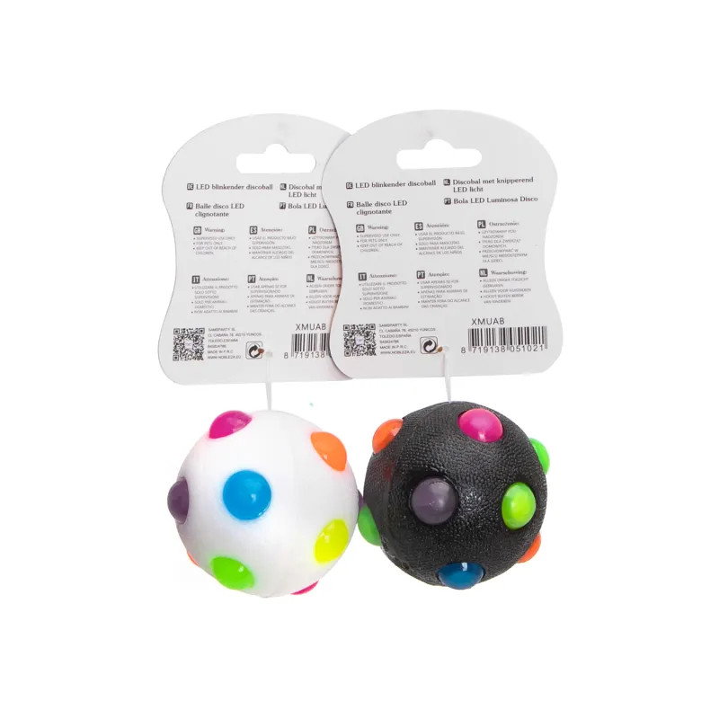 Świecąca piłka sensoryczna o średnicy 6cm dla psów, często określana jako kula LED disco. Zabawka aktywuje się i świeci po uderzeniu lub potoczeniu, co zachęca zwierzęta do aktywności.