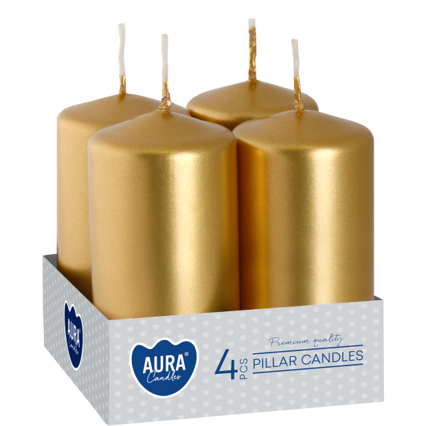 Zestaw czterech małych świec pieńkowych marki AURA w eleganckim, złotym metalicznym kolorze, który nadaje wnętrzu wyjątkowy, luksusowy charakter. Walce w tej barwie to doskonały wybór na dekorację dowolnego stołu, idealne na przyjęcia, bankiety, wesela czy kolacje. Złote świece wprowadzają ciepło, blask i elegancką atmosferę w salonie, sypialni czy łazience. To ponadczasowy wybór na święta, rocznice czy inne szczególne momenty, które warto uczcić w wyjątkowy sposób.