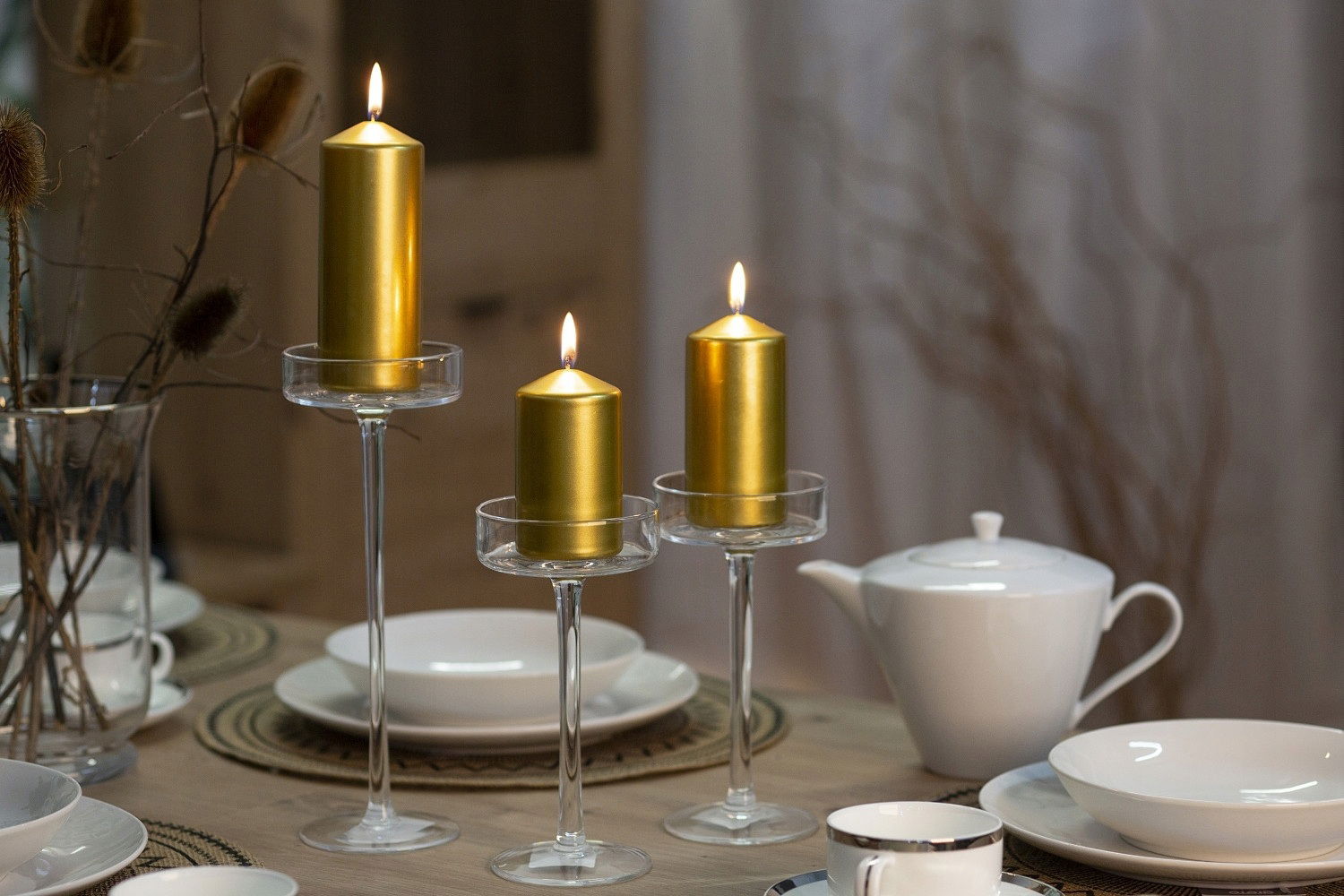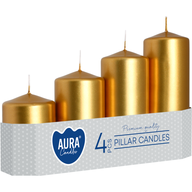 Zestaw czterech stopniowanych świec pieńkowych marki AURA w eleganckim, złotym metalicznym kolorze to doskonały wybór zarówno na co dzień, jak i na wyjątkowe okazje. Walce w tej szlachetnej, połyskującej barwie idealnie podkreślą dekoracje świątecznych stołów, glamour aranżacje oraz stylowe wnętrza. Umieszczone w różnych stylizacjach tworzą ciepłą, luksusową i przytulną atmosferę podczas spotkań. Wotywne świeczki w odcieniu złotego metaliku stanowią efektowne dopełnienie dekoracji sezonowych, pięknie komponując się z zielenią, czernią, bielą oraz dodatkami w stylu eleganckim i klasycznym.