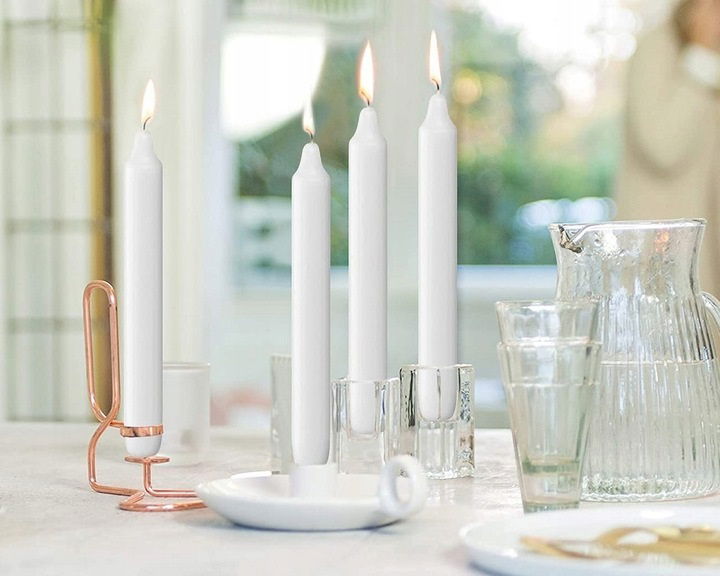 Smukłe świece w kształcie torpedy, dostępne również w innych kolorach oraz praktycznych zestawach, świetnie prezentują się w zarówno w nowoczesnych, jak i stylowych świecznikach. Eksponowane pojedynczo lub po kilka sztuk wprowadzają do wnętrz blask, ciepło i niezwykłą atmosferę. Umieść świecę w świeczniku, odpal ją i ciesz się klimatem romantycznej kolacji, rodzinnego spotkania czy odwiedzin znajomych.