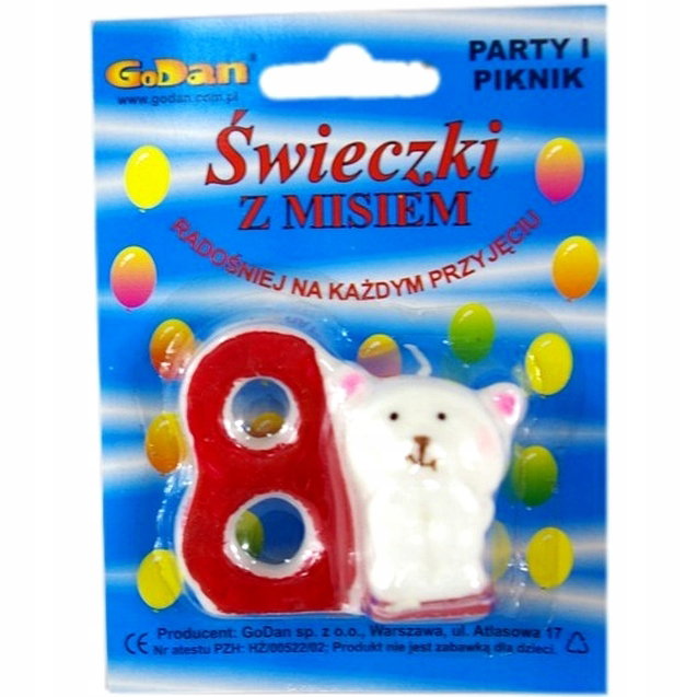 Świeczka urodzinowa cyfra „8” z misiem o wysokości 5 cm to słodka dekoracja tortu. Przyjazny design sprawia, że doskonale pasuje do dziecięcych przyjęć. Produkt zapakowany w blister, co chroni go przed zniszczeniem. Idealny wybór na urodziny najmłodszych.