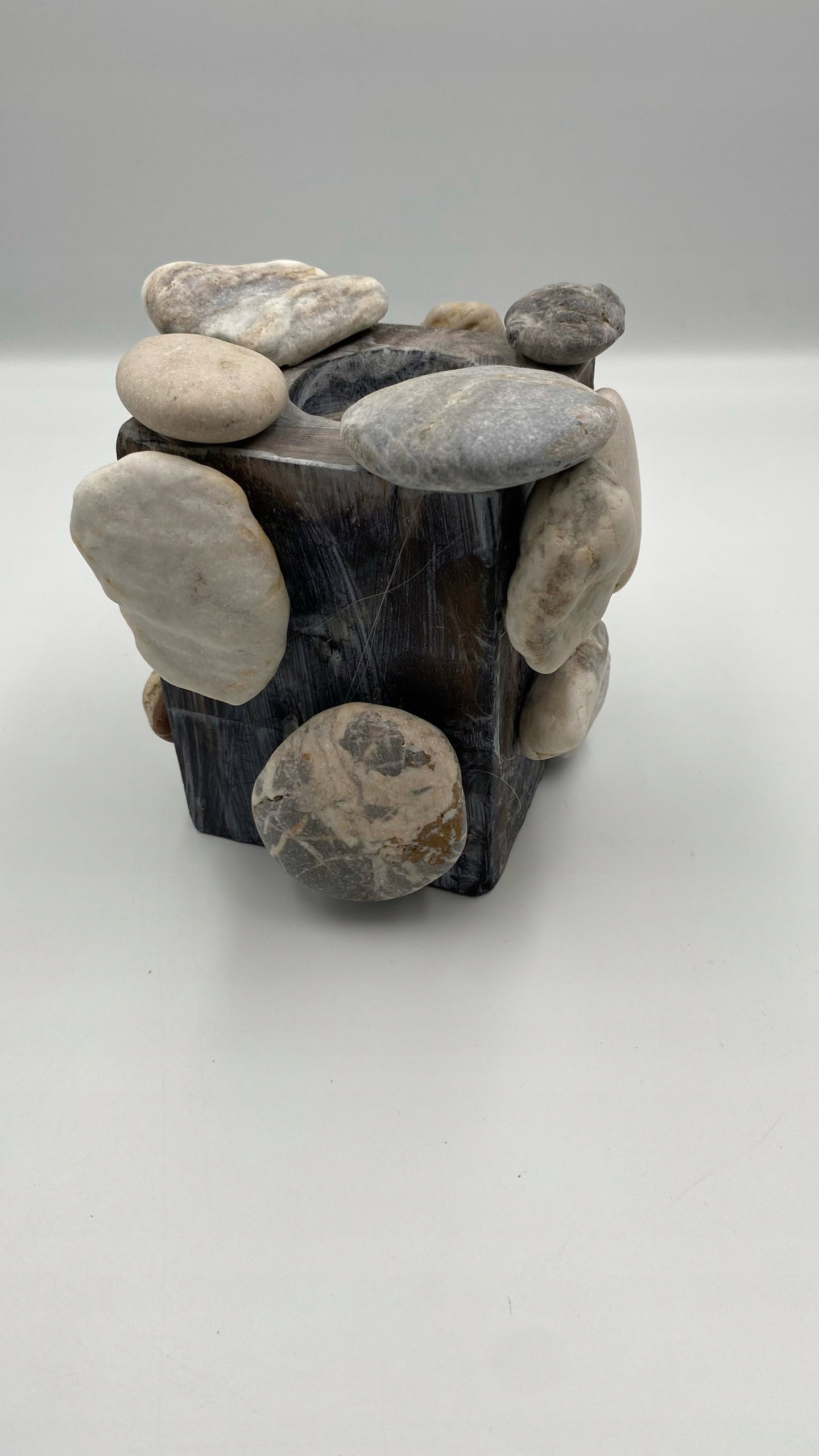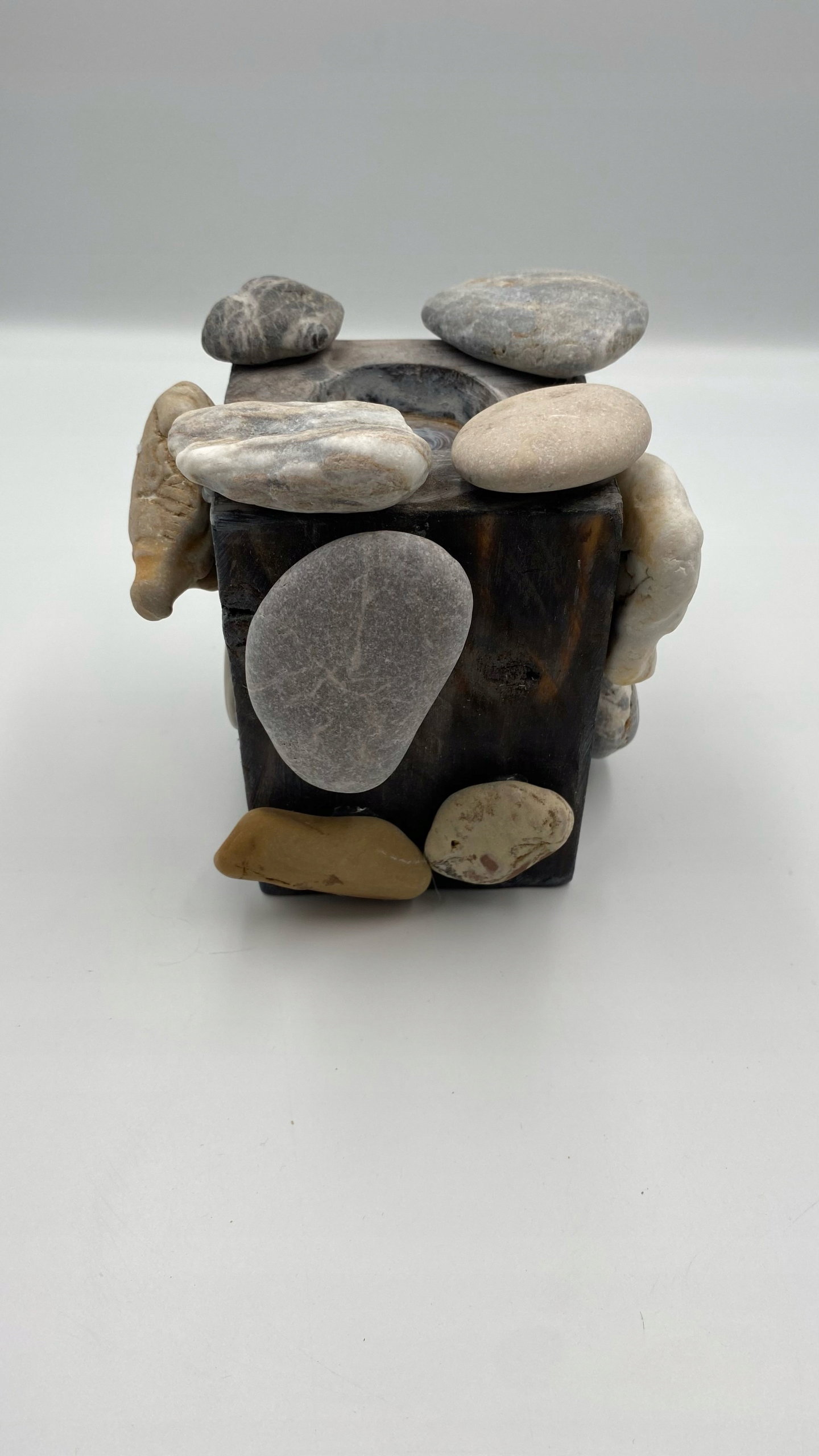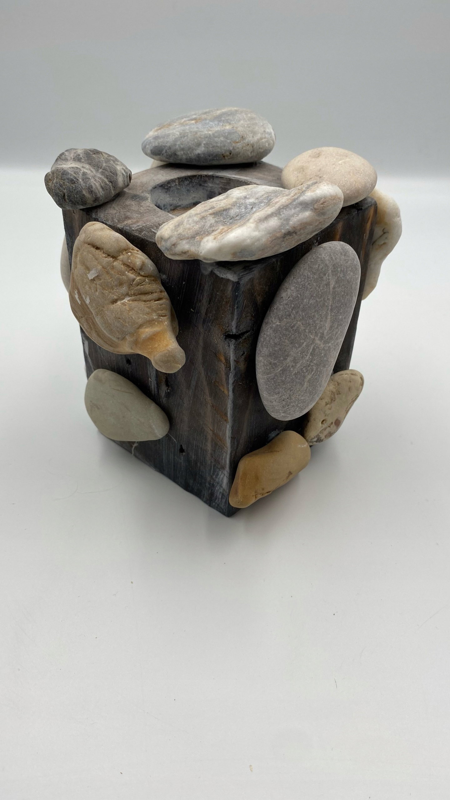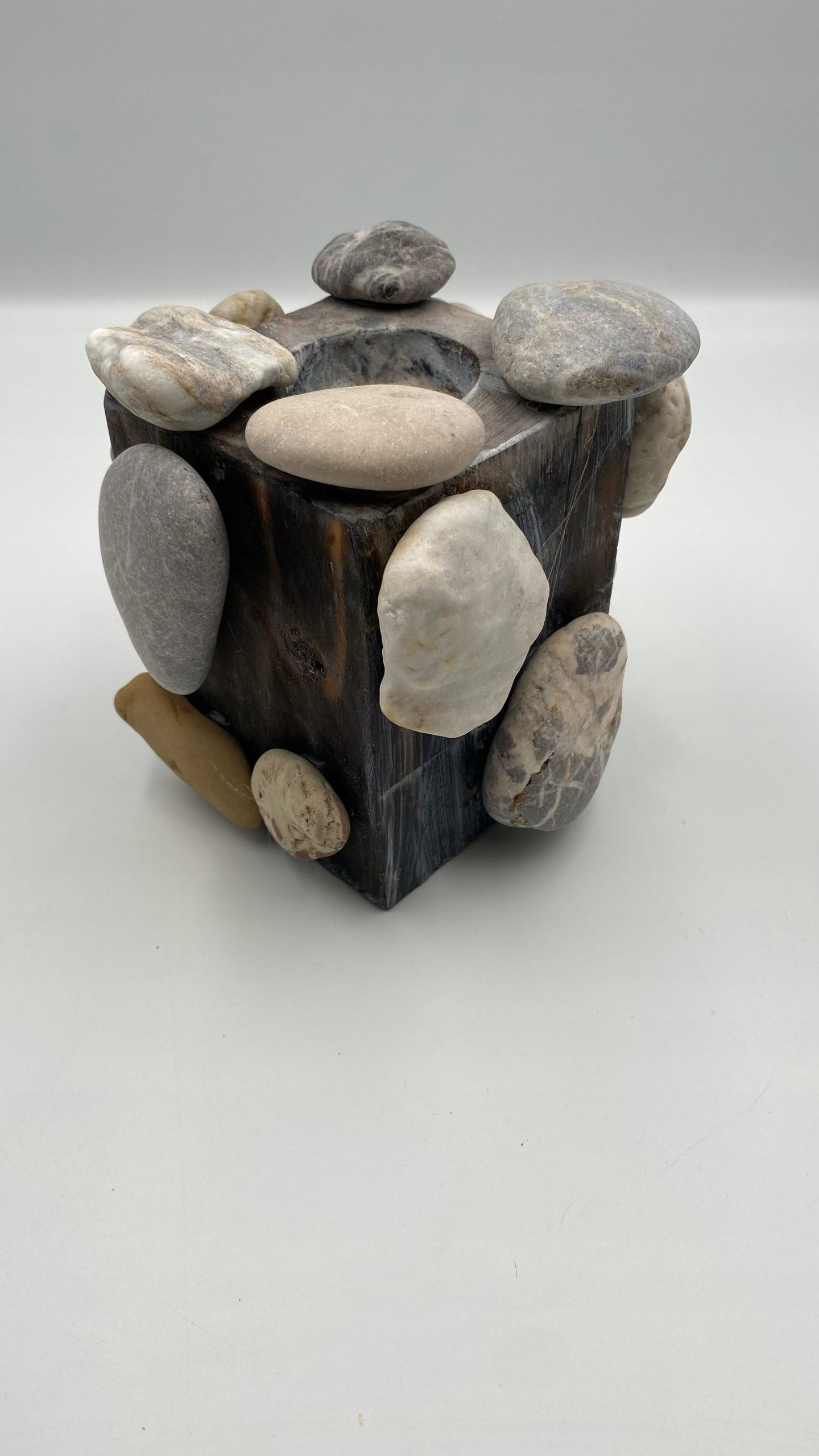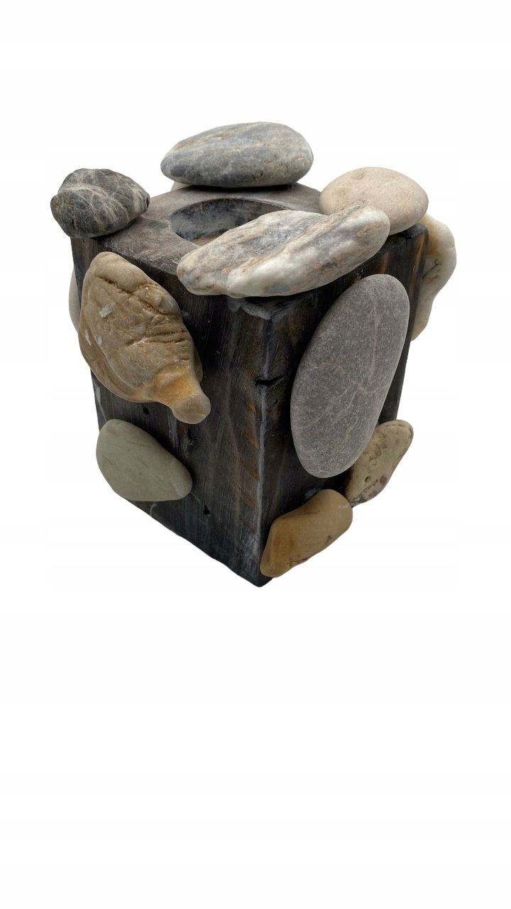Ten świecznik nie tylko rozprasza delikatne światło świec, ale także stanowi wyjątkowy element dekoracyjny, podkreślając piękno prostoty i surowości naturalnych materiałów.