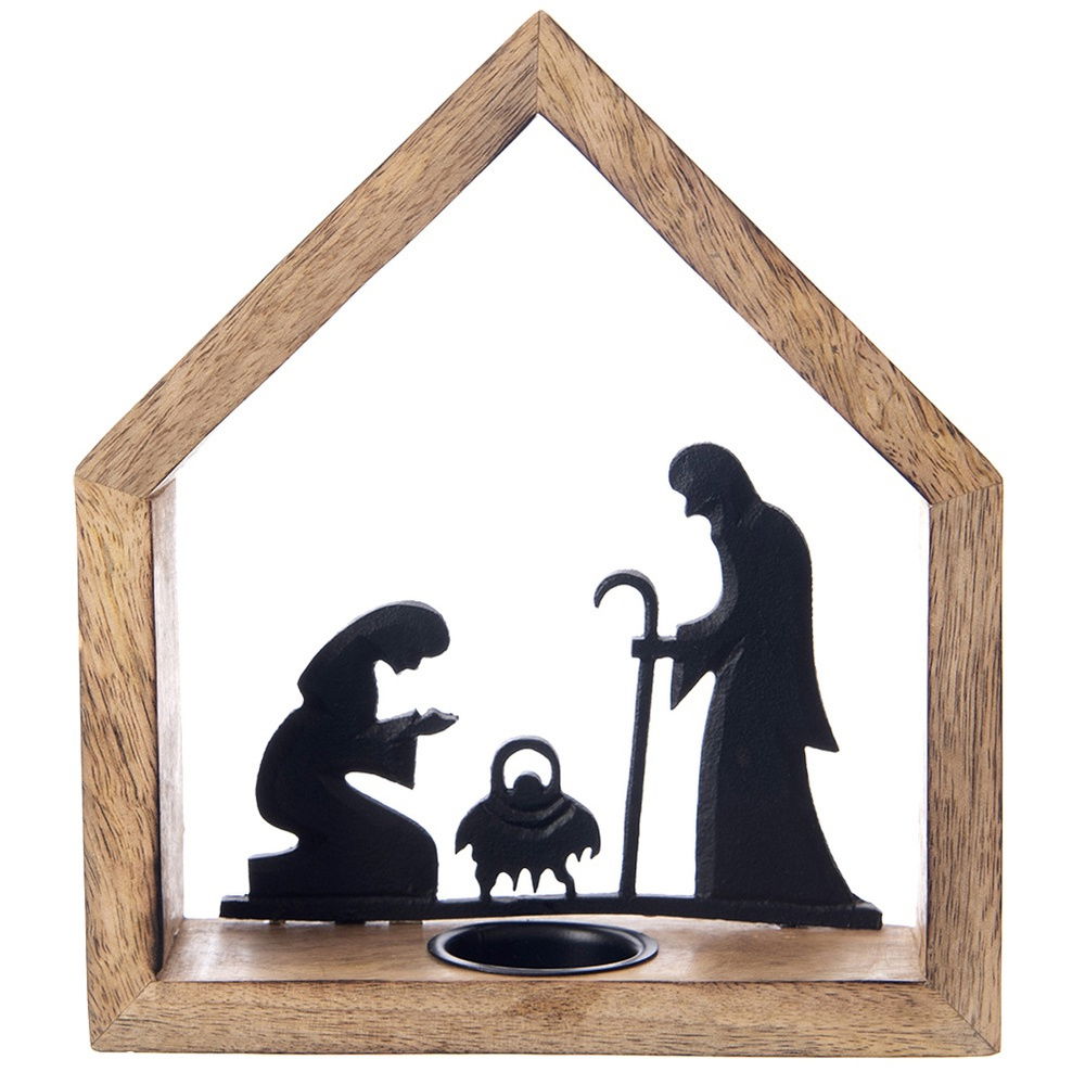 Wykonany z drewna mangowca - Świecznik wykonany jest z naturalnego drewna mangowca, które wyróżnia się piękną, wyrazistą strukturą i naturalną barwą. Dodatkowo posiada efektowne figurki w kształcie Świętej Rodziny wykonane z metalu w czarnym kolorze. To ręcznie robiona dekoracja z naturalnego drewna, dlatego każdy egzemplarz może różnić się usłojeniem, odcieniem i detalami wykończenia, co czyni go niepowtarzalnym.