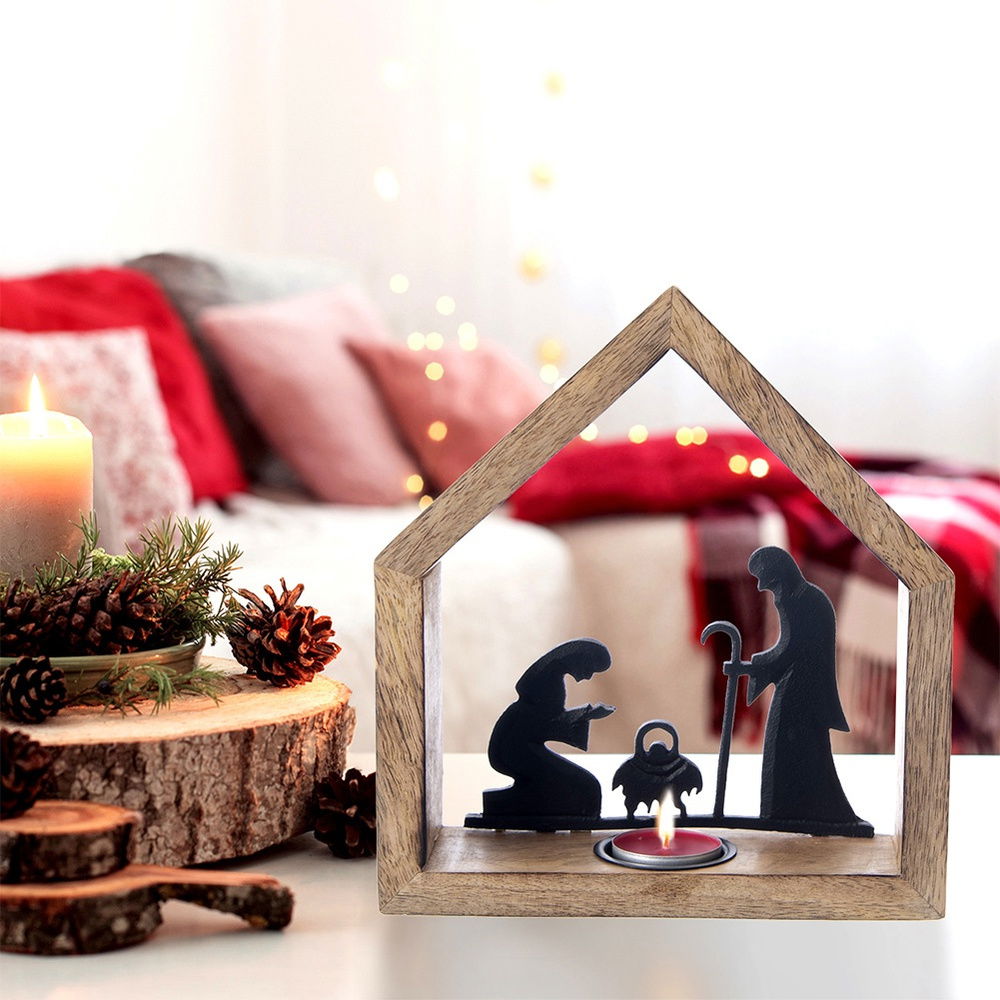 Efektowny świecznik z motywem szopki - Dekoracyjny świecznik w kształcie domku z motywem betlejemskiej szopki, który wprowadzi do wnętrza przytulny nastrój. Doskonale prezentuje się na komodzie, parapecie czy stole. Wymiary świecznika wynoszą 20 x 6 x 22 cm.