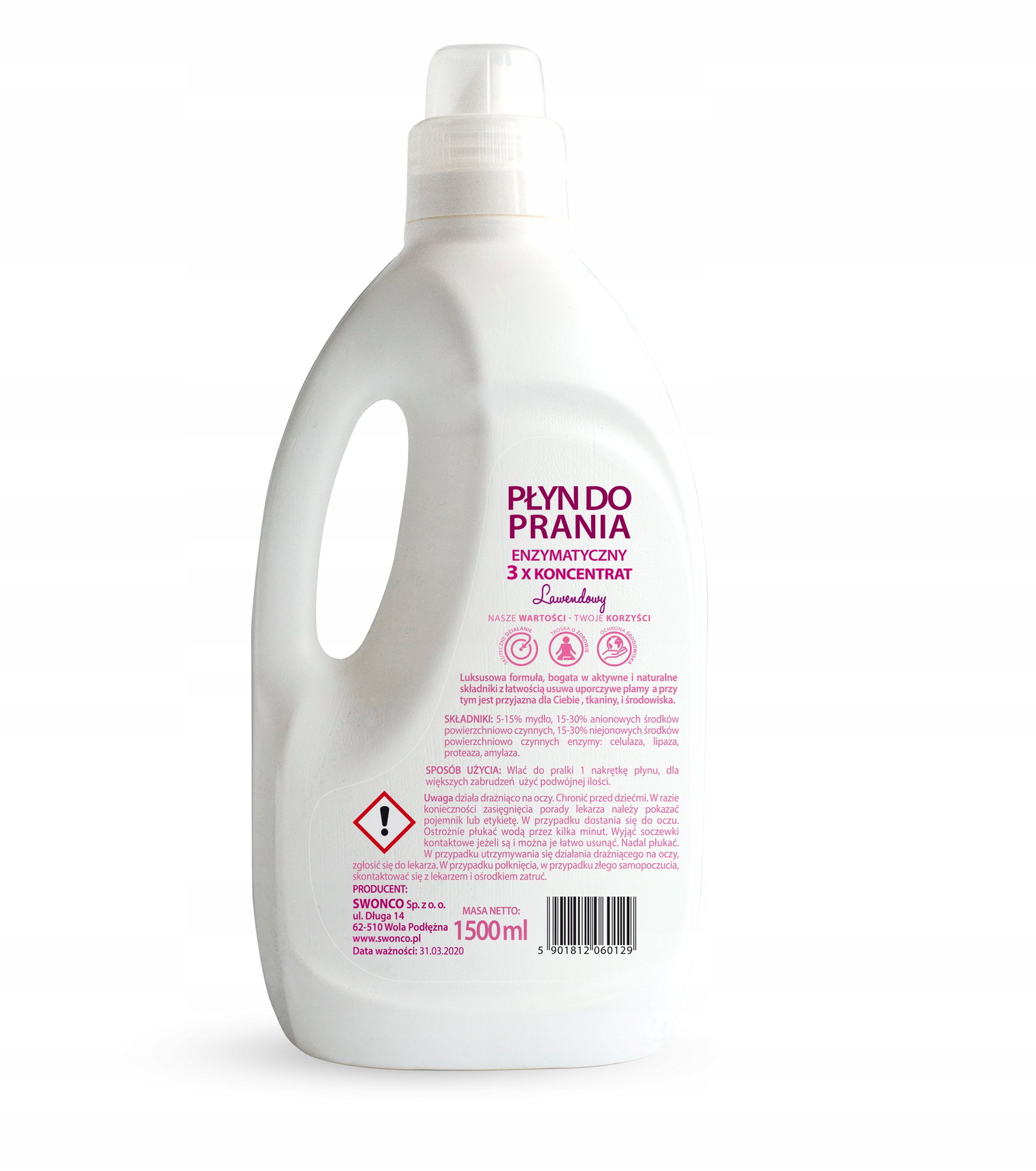 Płyn do prania lawendowy to moc roślin, enzymów i składników mineralnych z dodatkiem lawendowego olejku eterycznego Lavandula Angustifolia – najbardziej luksusowego ze wszystkich tego typu dostępnych na świecie. Nasze płyny to prawdziwe koncentraty. Płyny są uniwersalne do tkanin kolorowych, białych i czarnych.