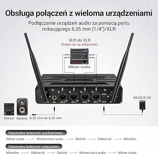 Obsługa wielu urządzeń: Dzięki dołączonemu kablowi audio 1/4” (6,35 mm) mikrofon jest kompatybilny z urządzeniami takimi jak miksery, maszyny do karaoke, wzmacniacze, zasilane głośniki i inne. Aby uzyskać optymalną jakość dźwięku, podłącz mikrofon do wejścia „MIC IN” w głośniku.