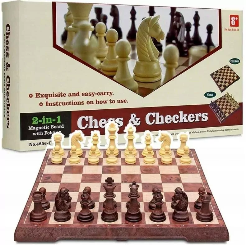 Zestaw gier planszowych 2w1: szachy magnetyczne i warcaby. Składana plansza z funkcją magnesu umożliwia grę w podróży – figury szachowe przyciągane są do planszy, co zapobiega ich przesuwaniu. Pionki do warcabów nie są magnetyczne.