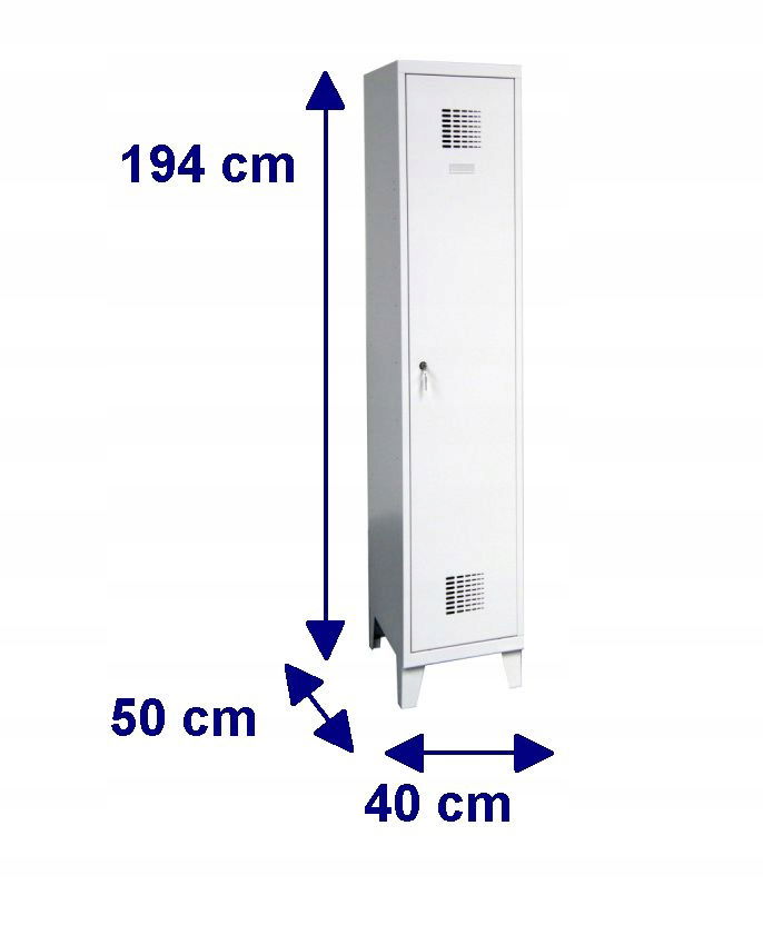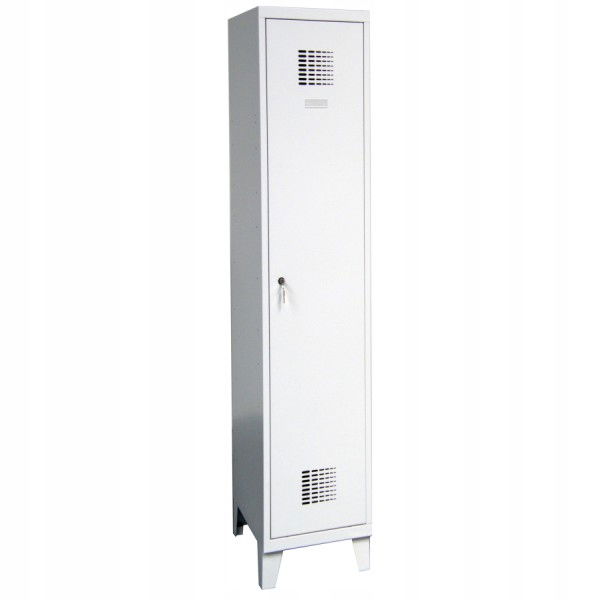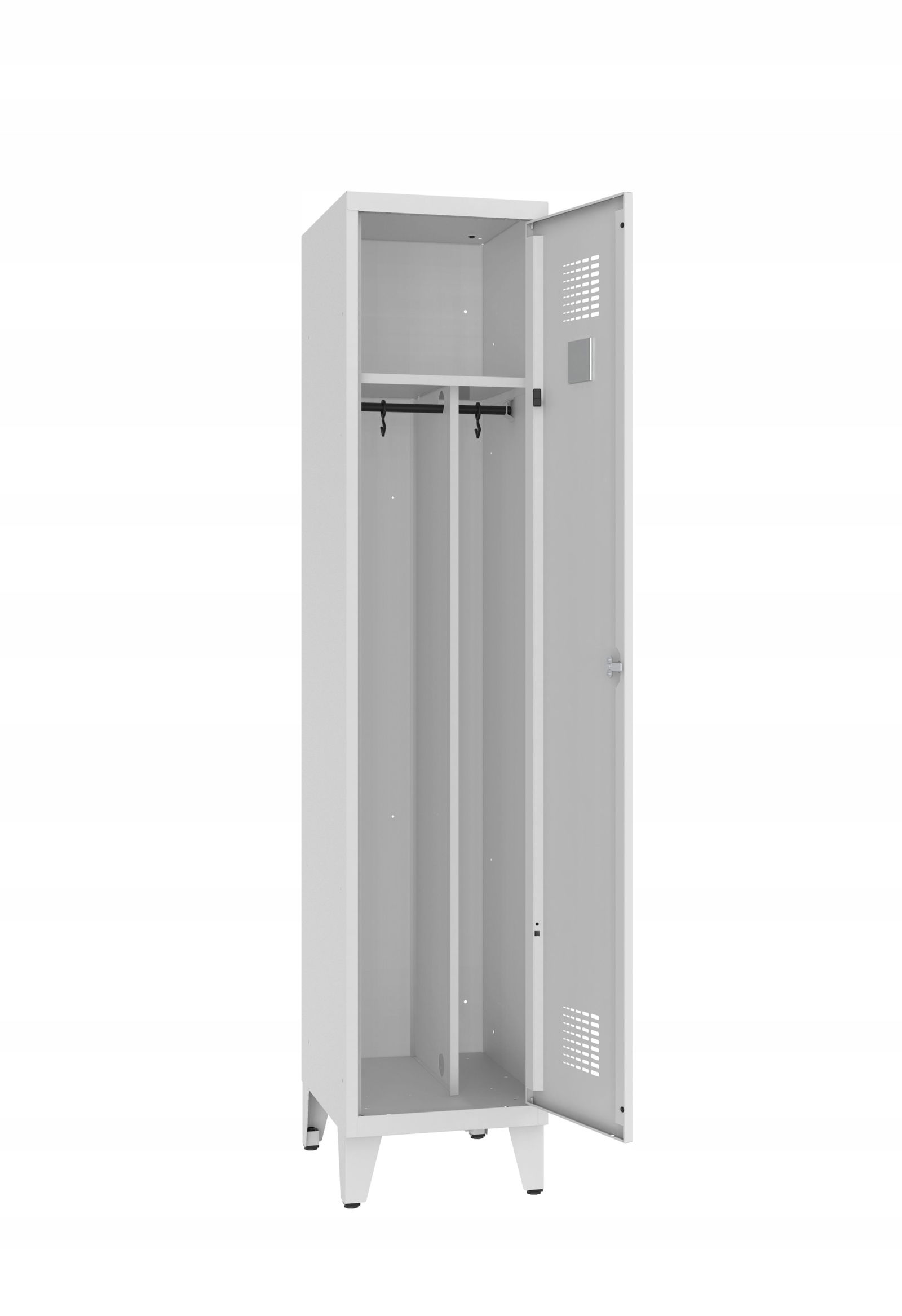 Polecamy szafę metalową ubraniową szerokości 40 cm na nóżkach. Szafa jednodrzwiowa o funkcjonalnym i estetycznym wyglądzie. Szafa socjalna jest wyposażona w plastikowy drążek, wieszaki ubraniowe, haczyk na ręczniki i lusterko. W szafie wewnątrz przegroda pionowa. Z przodu na drzwiach samoprzylepny plastikowy wizytownik. Drzwi szafy posiadają wentylację o nowoczesnym wyglądzie. Szafa socjalna wykonana z blachy 0,5 mm. Szafa wyposażona w zamek cylindryczny zamykany w jednym punkcie. Wysokość nóżek 14 cm. Nóżka wyposażona w stopkę regulacyjną w zakresie 10 mm do wypoziomowania szafy.