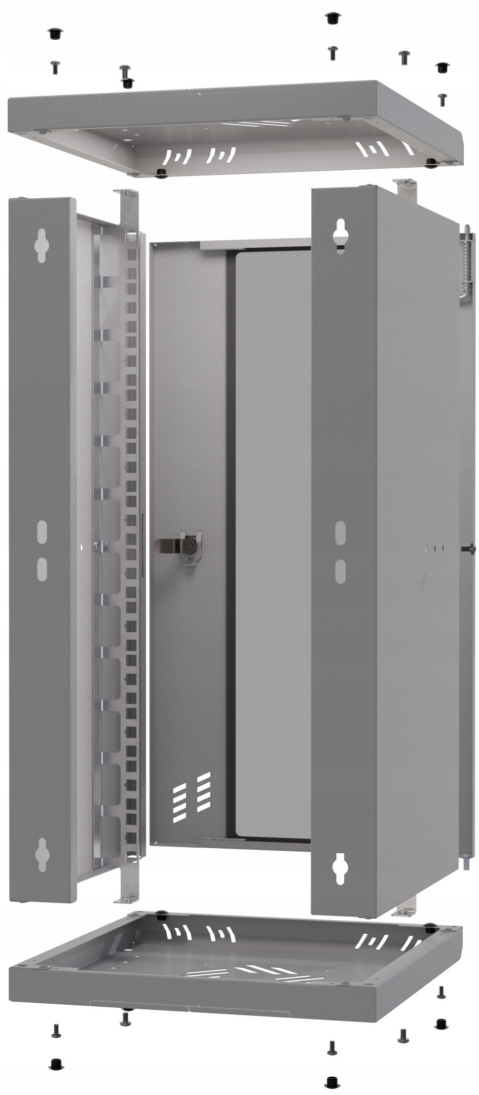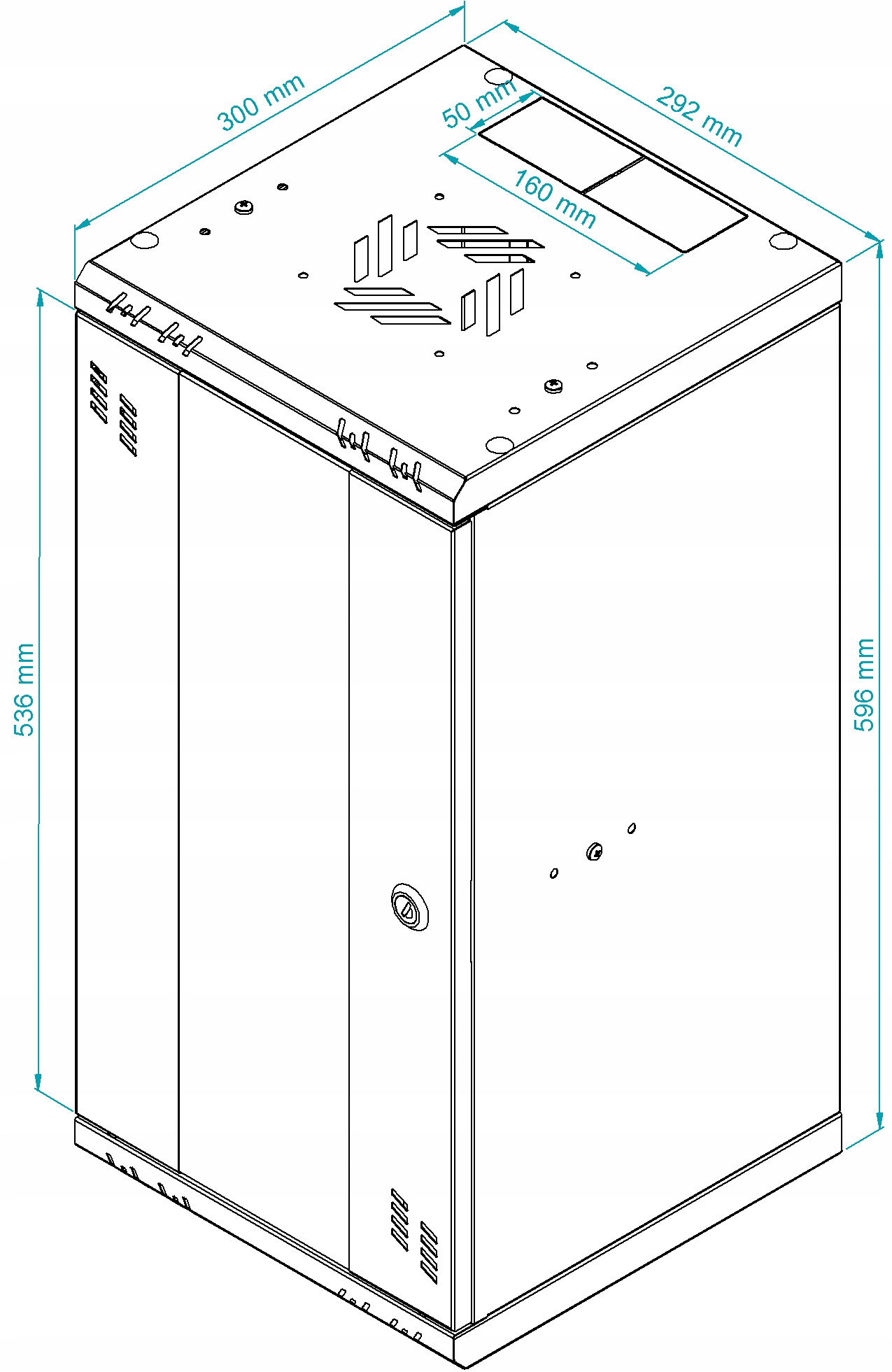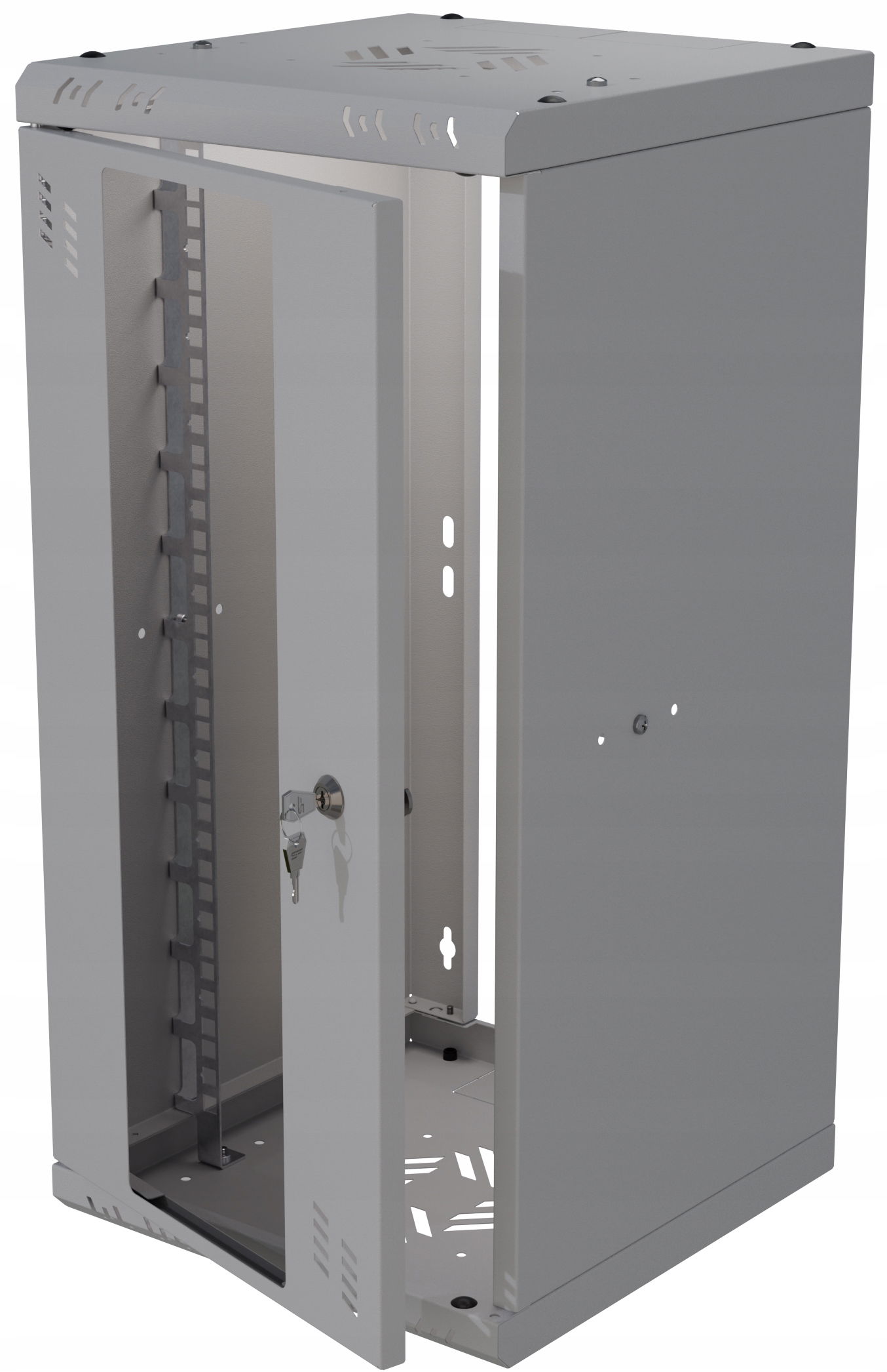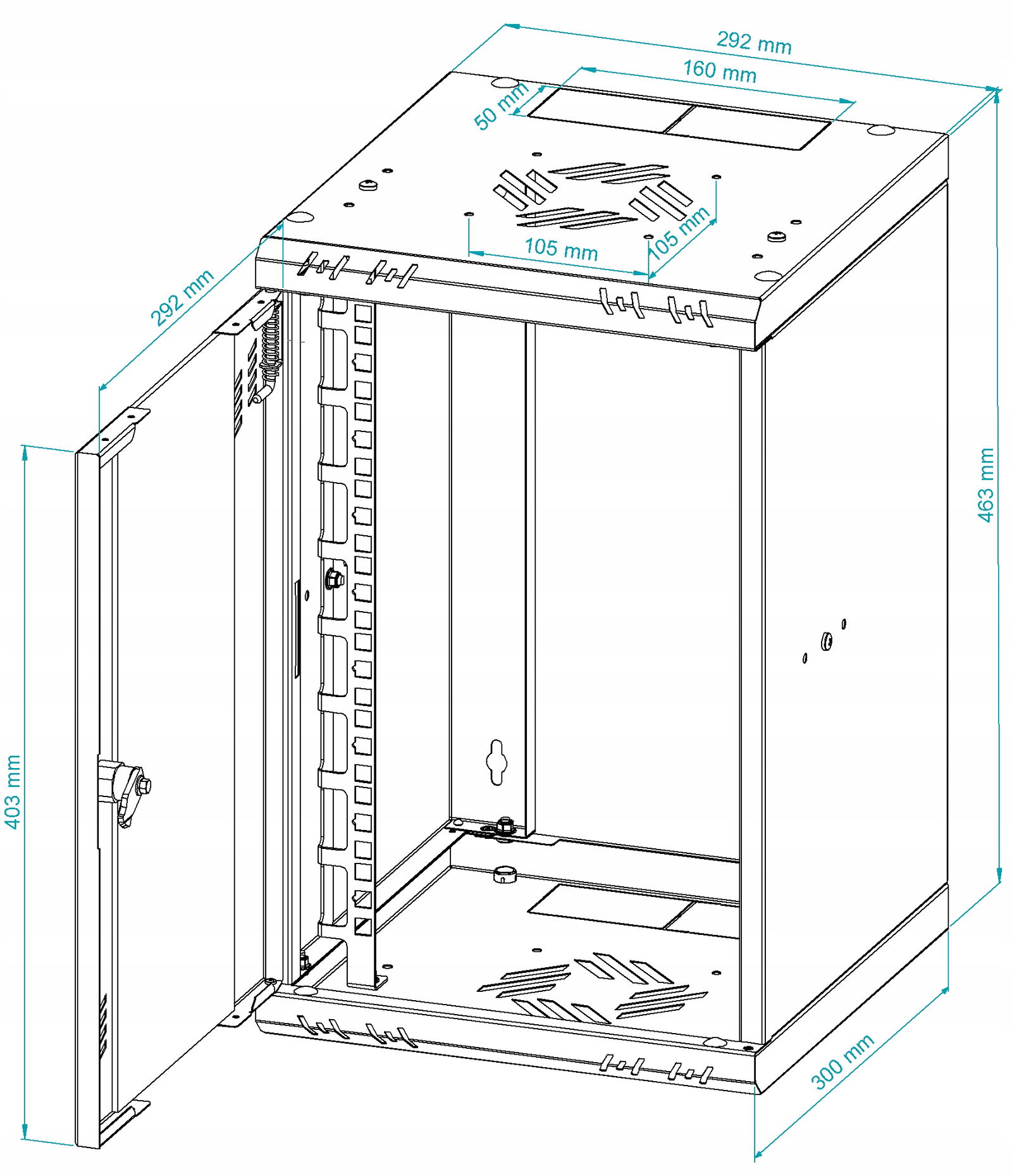 - dodatkowe otwory wentylacyjne – w górnej i dolnej części szafy oraz od frontu i po bokach, zapewniające prawidłową cyrkulację powietrza.