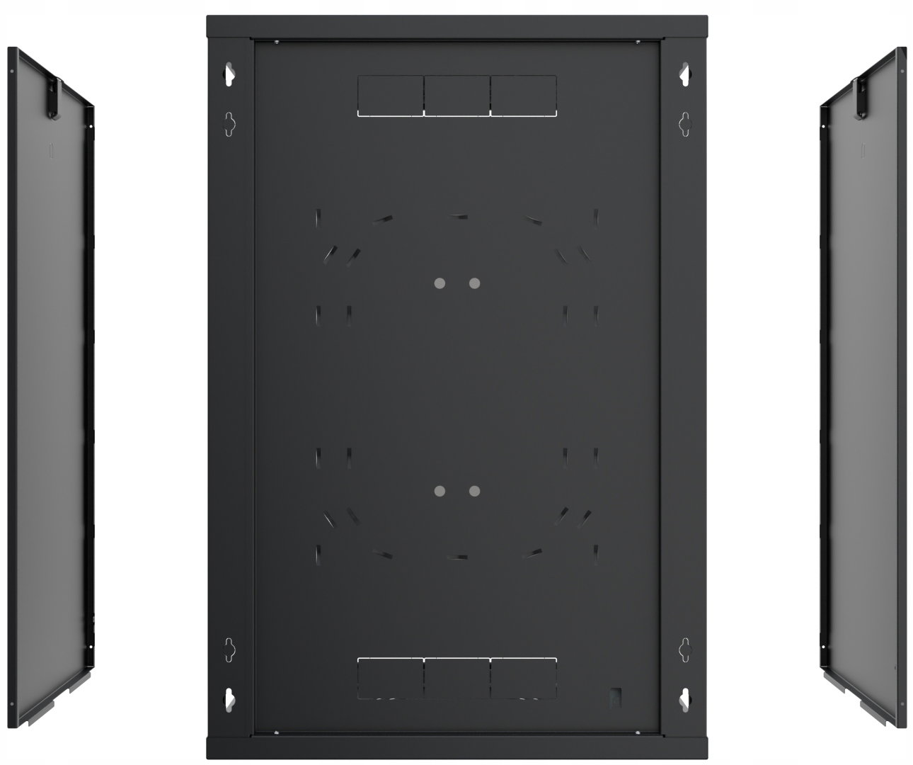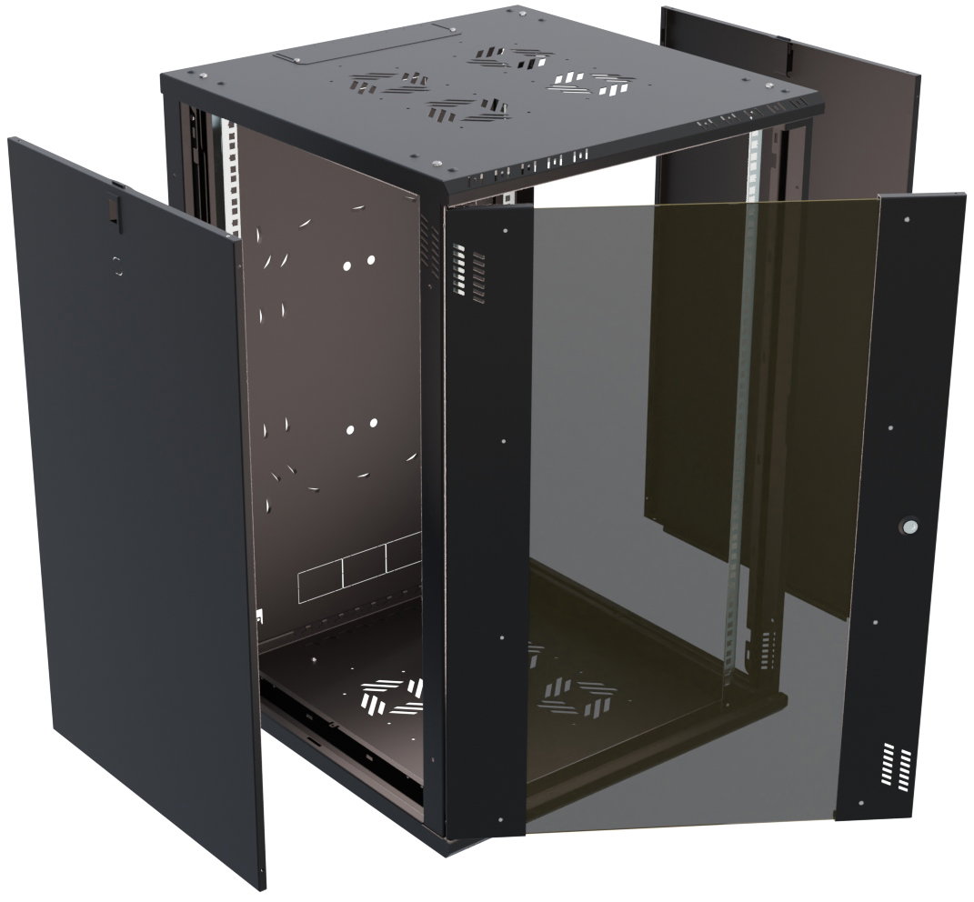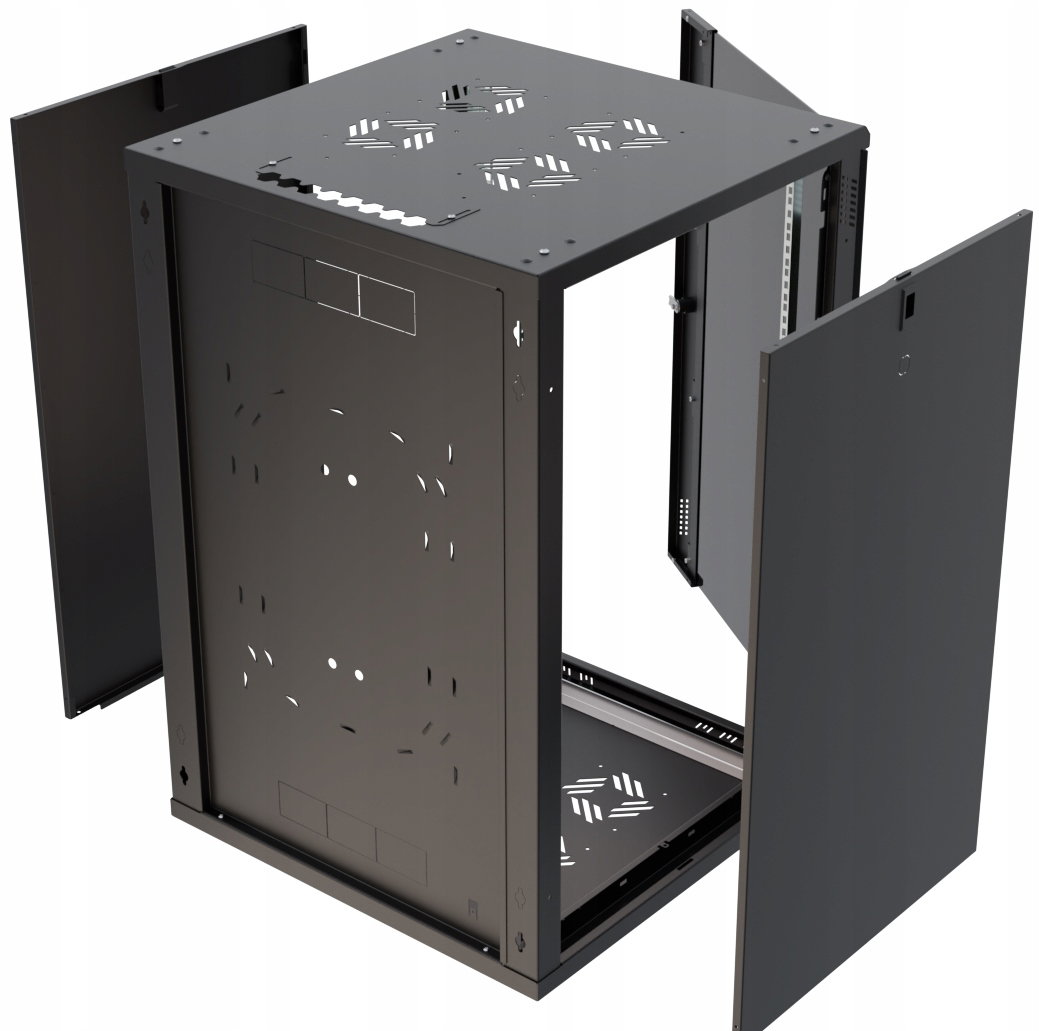 Regulowane przepusty kablowe w górnej i dolnej części obudowy ułatwiają swobodne wyprowadzenie okablowania. Dodatkowe otwory wentylacyjne umieszczone z przodu, na górze i dole szafy, a także możliwość montażu wentylatorów, zapewniają odpowiednią cyrkulację powietrza, chroniąc urządzenia przed przegrzaniem. Szafa wyposażona jest w regulowane listwy montażowe, co umożliwia elastyczną aranżację wewnętrznej przestrzeni oraz łatwy montaż akcesoriów RACK 19".