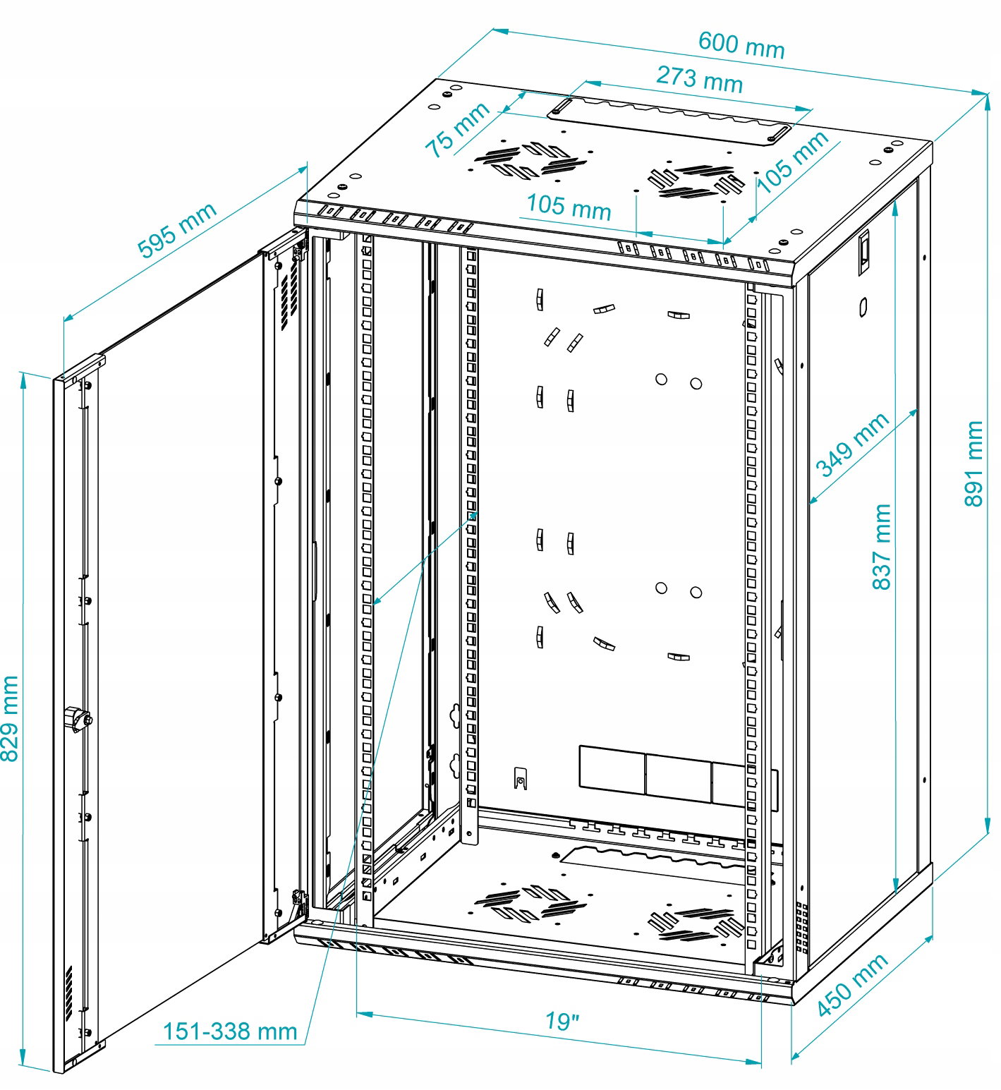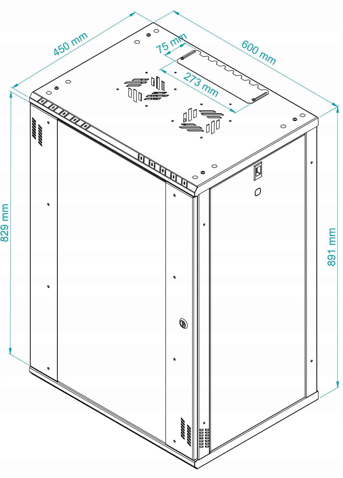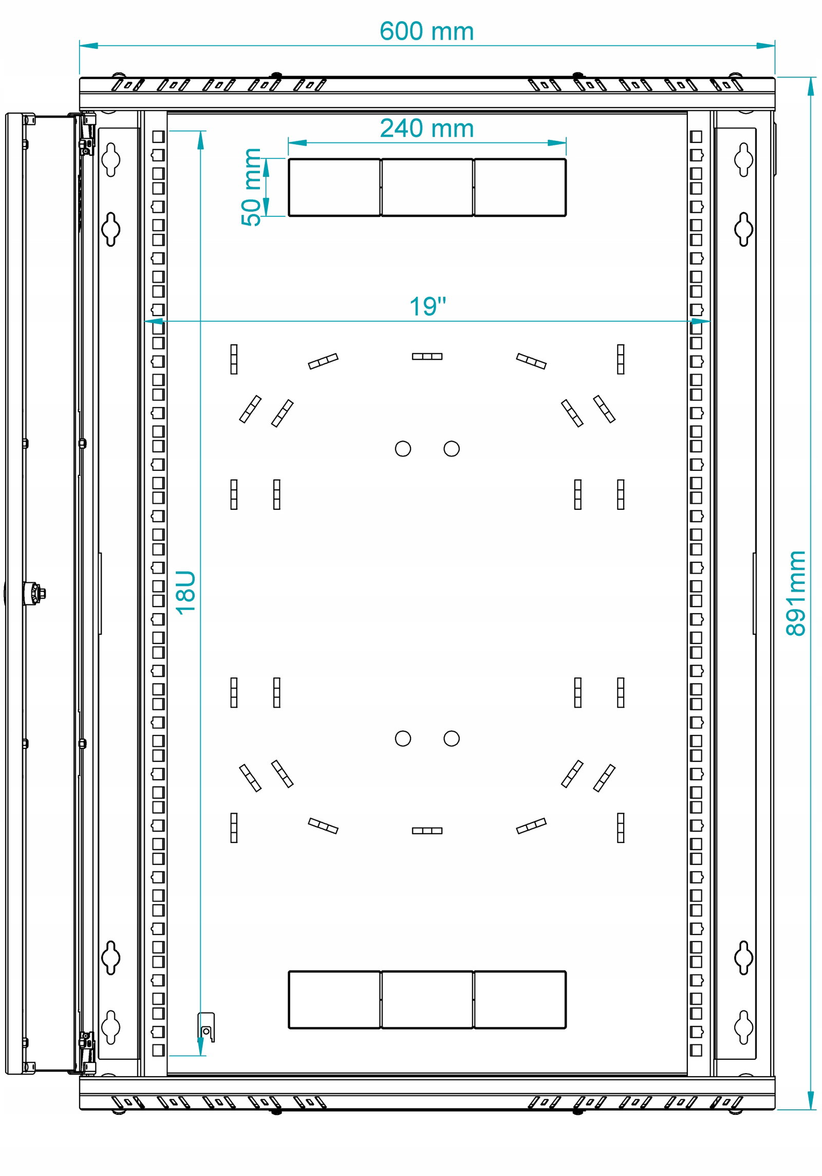 Regulowane przepusty kablowe w górnej i dolnej części obudowy ułatwiają swobodne wyprowadzenie okablowania. Dodatkowe otwory wentylacyjne umieszczone z przodu, na górze i dole szafy, a także możliwość montażu wentylatorów, zapewniają odpowiednią cyrkulację powietrza, chroniąc urządzenia przed przegrzaniem. Szafa wyposażona jest w regulowane listwy montażowe, co umożliwia elastyczną aranżację wewnętrznej przestrzeni oraz łatwy montaż akcesoriów RACK 19".