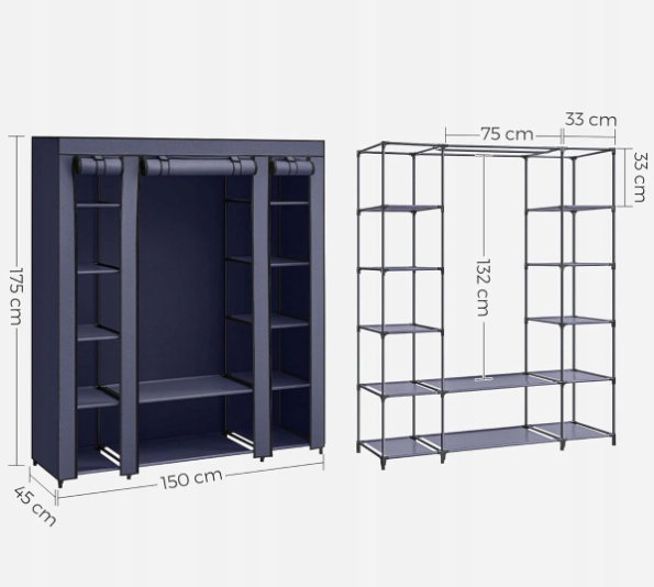 - ✴️Duża pojemność: ta szafa z tkaniny ma wymiary 45 x 150 x 175 cm i zapewnia wystarczająco dużo miejsca do uporządkowania ubrań całej rodziny. Powierzchnia do zawieszenia ma 132 cm wysokości na długie ubrania, takie jak płaszcze czy kołdry.