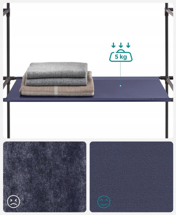 - ✴️Doskonała stabilność: szafa wykonana jest z grubych metalowych rur o średnicy 16 mm, wysokiej jakości łączników z tworzywa sztucznego i włókniny 120 g/m2. Wieszak może wytrzymać obciążenie do 15 kg, a każda półka może wytrzymać do 5 kg.