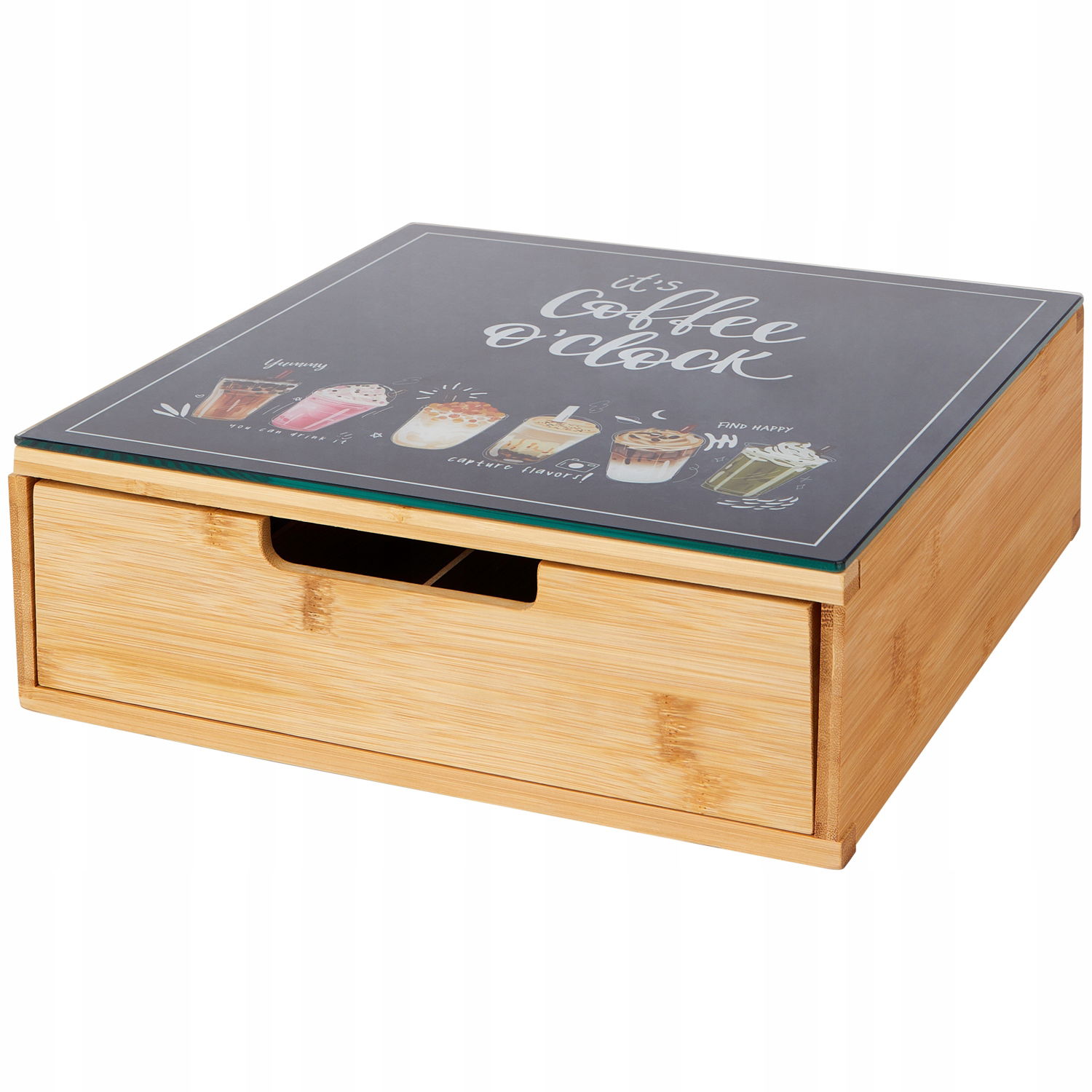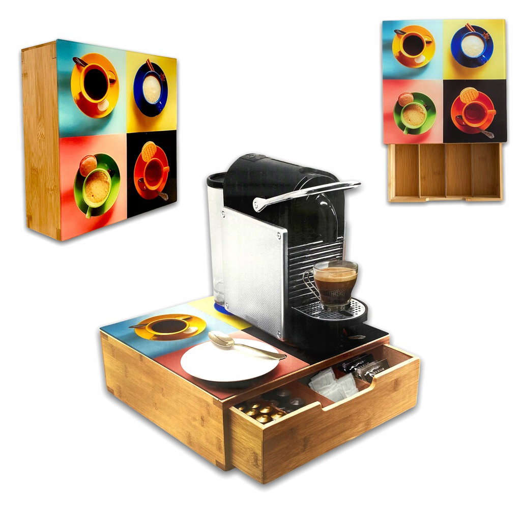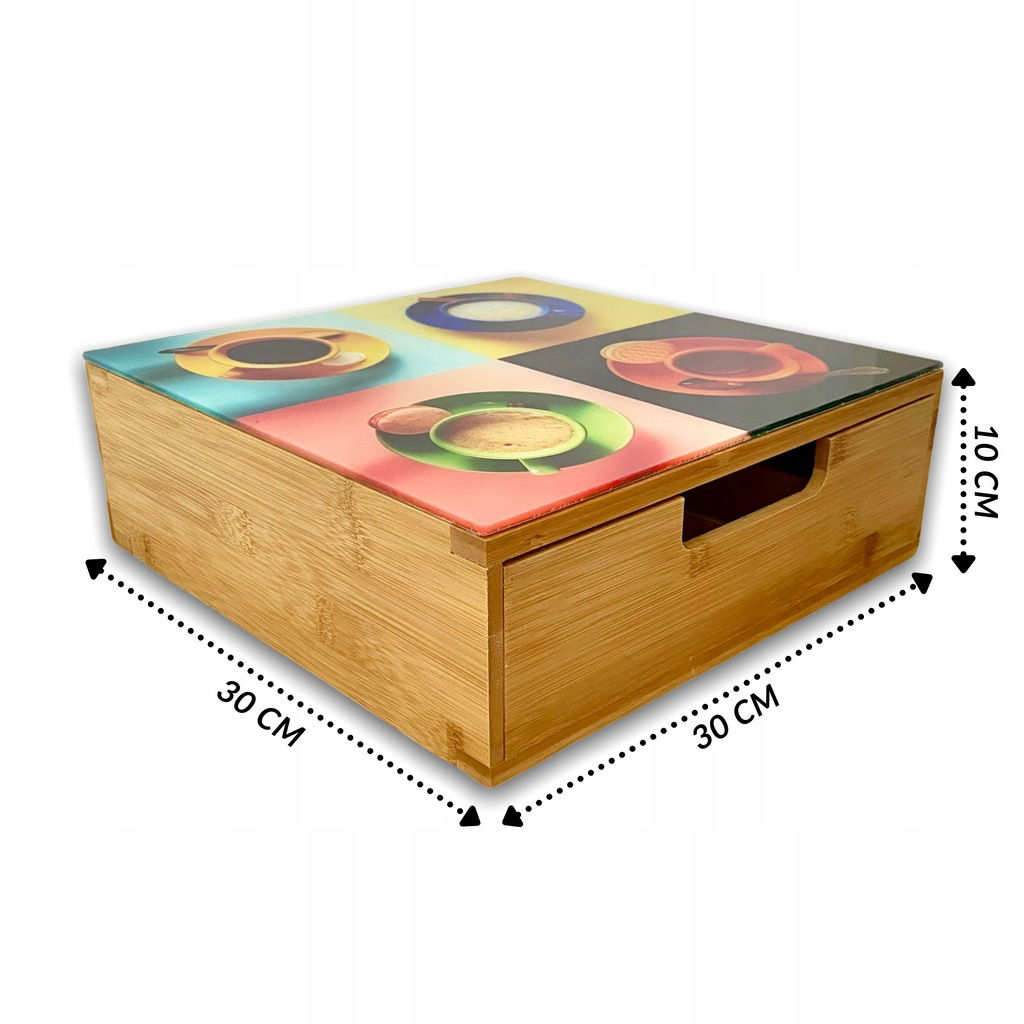 Pojemnik z szufladą posiada szklany blat o wymiarach 30 x 30 cm - ozdobiony grafiką przedstawiającą proces parzenia kawy. Przystosowany pod ekspres kapsułkowy lub ciśnieniowy. Wszelkie zabrudzenia na blacie będą łatwe do usunięcia.