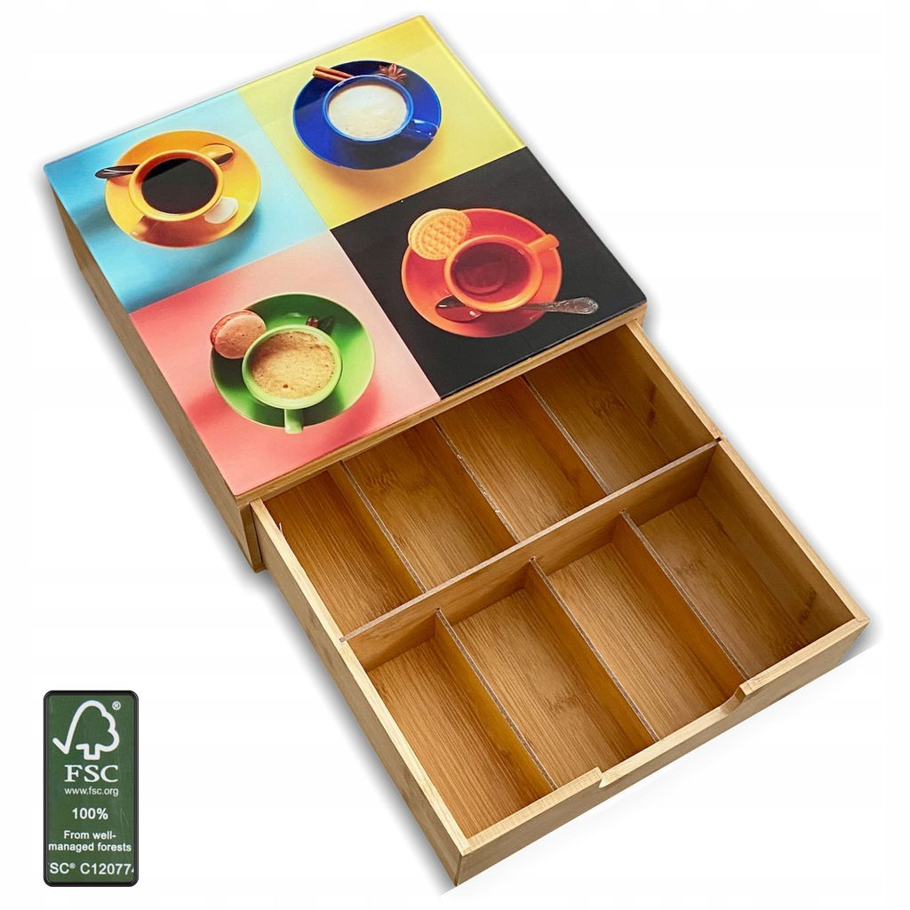 SZAFKA BAMBUSOWA ORGANIZER Z SZUFLADĄ NA KAWĘ HERBATĘ GRAFIKA SZKLANY BLAT