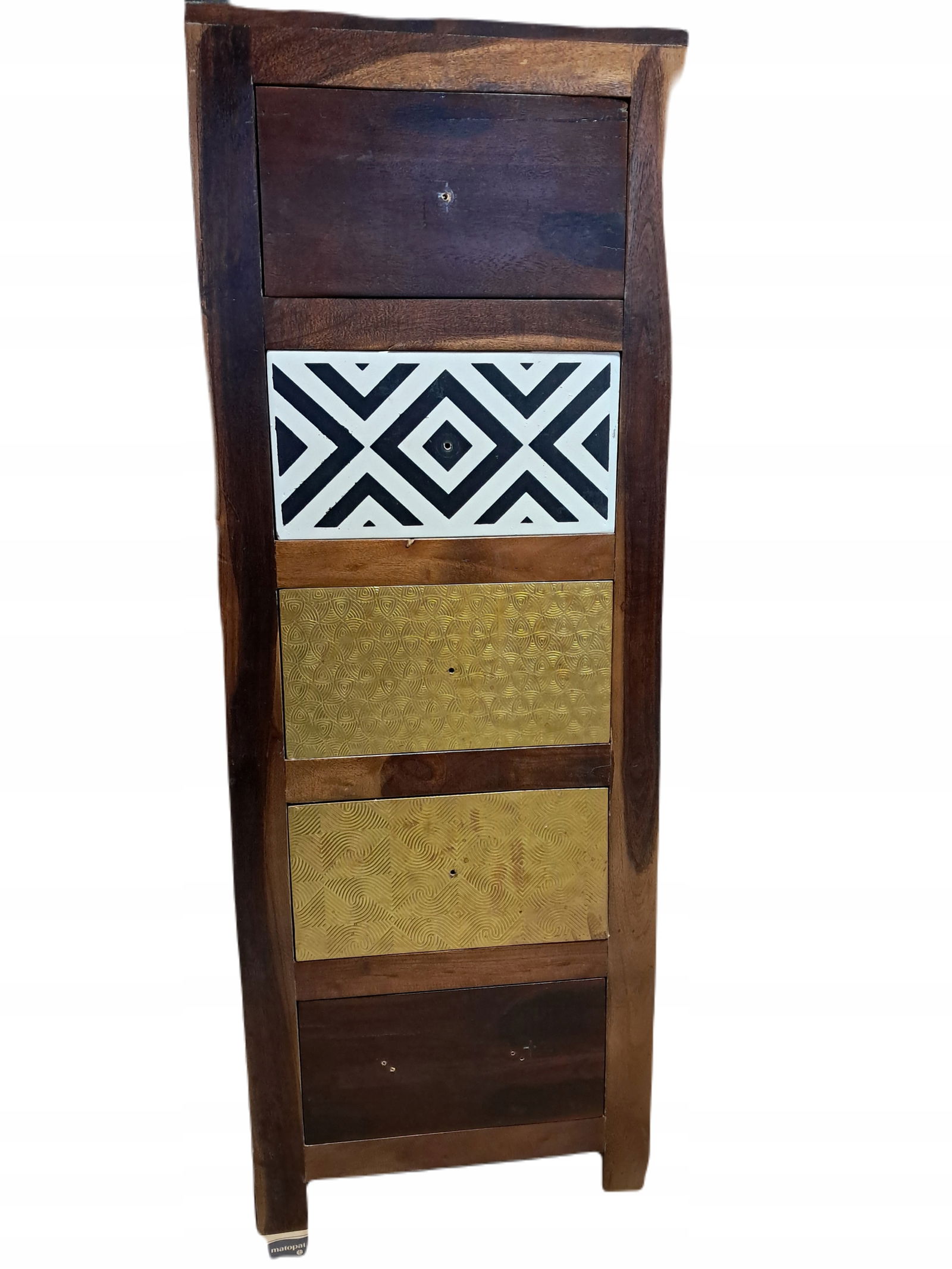 Wykonana z prawdziwego, litego drewna sheesham z delikatnymi, różnymi wzorami, wytrzymała szafka roztacza czar vintage. Sheesham, znany również jako drzewo różane i palisander, to twarde drewno tropikalne słynące z bogatego usłojenia. Materiał ten został pięknie wykończony poprzez polerowanie, malowanie i lakierowanie, dzięki czemu szafka emanuje wyrafinowanym wyglądem. Ponadto 5 szuflad zapewnia mnóstwo miejsca na uporządkowanie rzeczy w zasięgu ręki. Montaż jest łatwy.