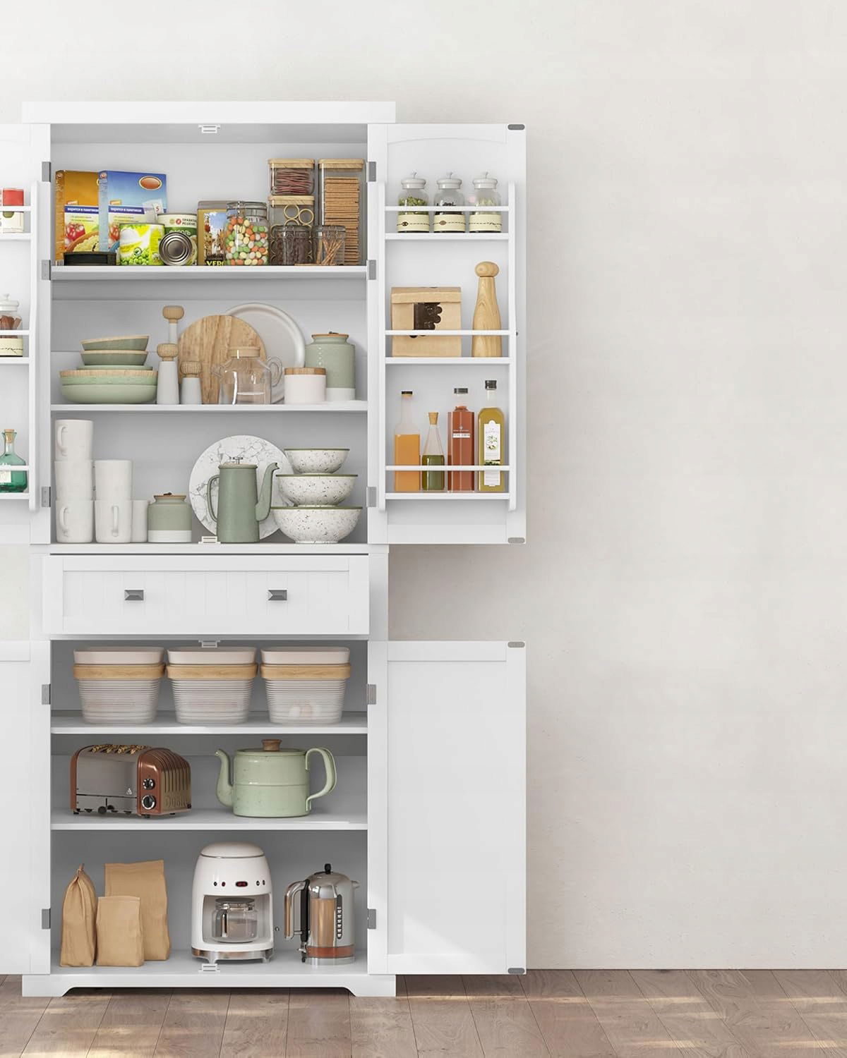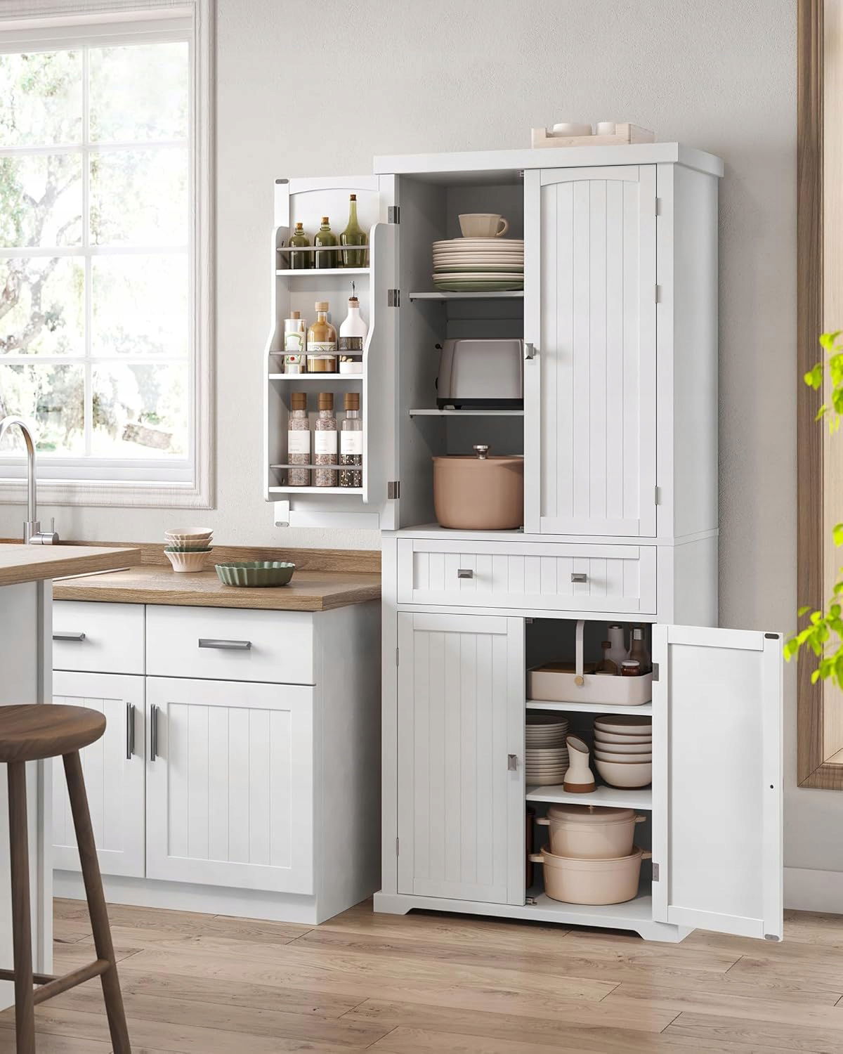 - Ogromna pojemność: dzięki 2 dużym szafkom, przestronnej szufladzie i 6 przegródkom z drzwiczkami, ta szafka kuchenna oferuje wystarczająco dużo miejsca na żywność, naczynia i sprzęt kuchenny, a także gwarantuje porządek bez względu na to, gdzie ją umieścisz