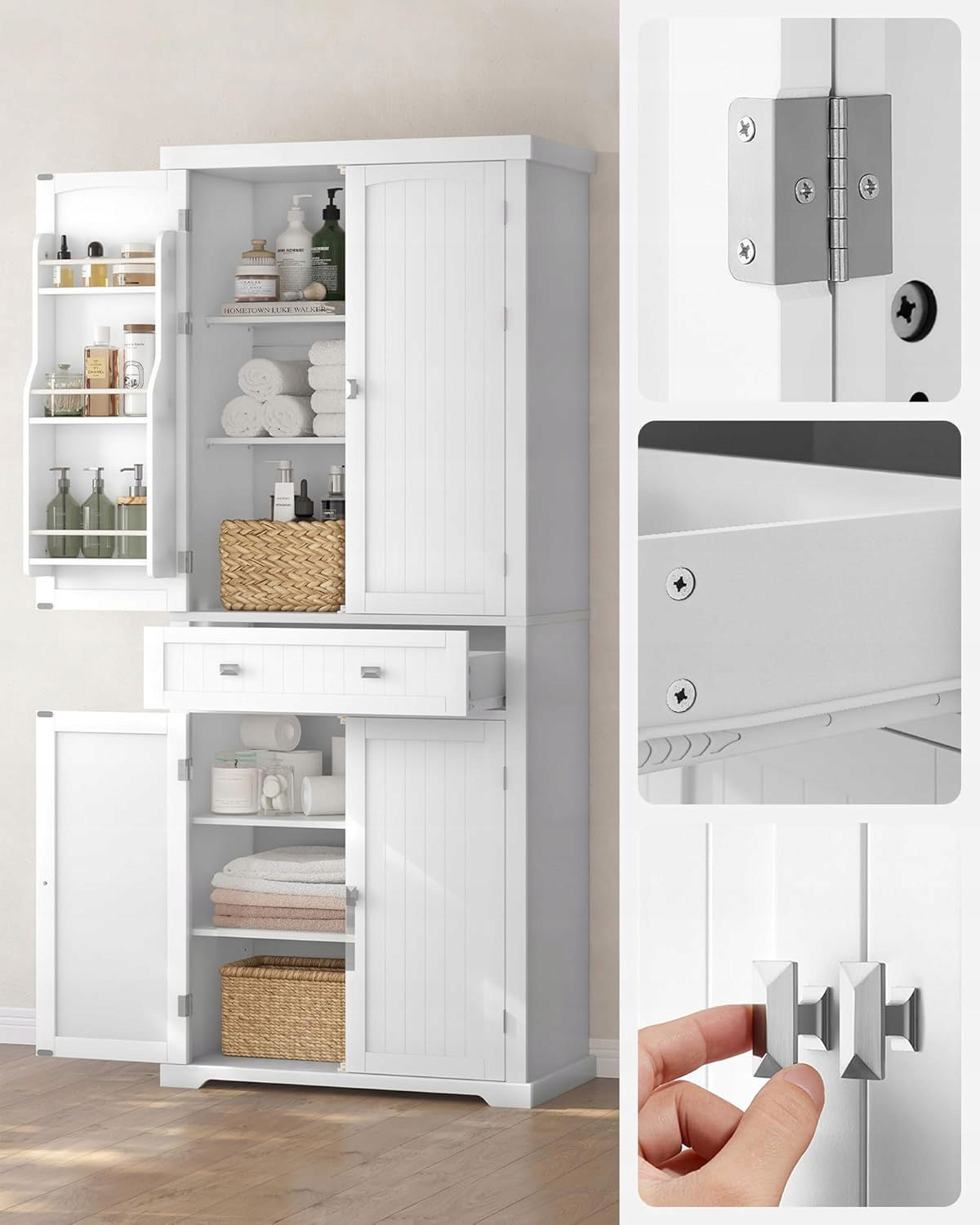 - Uniwersalność: wyjątkowe drzwi szafki, srebrne uchwyty w kształcie diamentów i czyste linie nadają szafce wiejski styl, który z łatwością dopasuje się do Twojej kuchni, jadalni, łazienki lub gabinetu, zapewniając jednocześnie styl i porządek