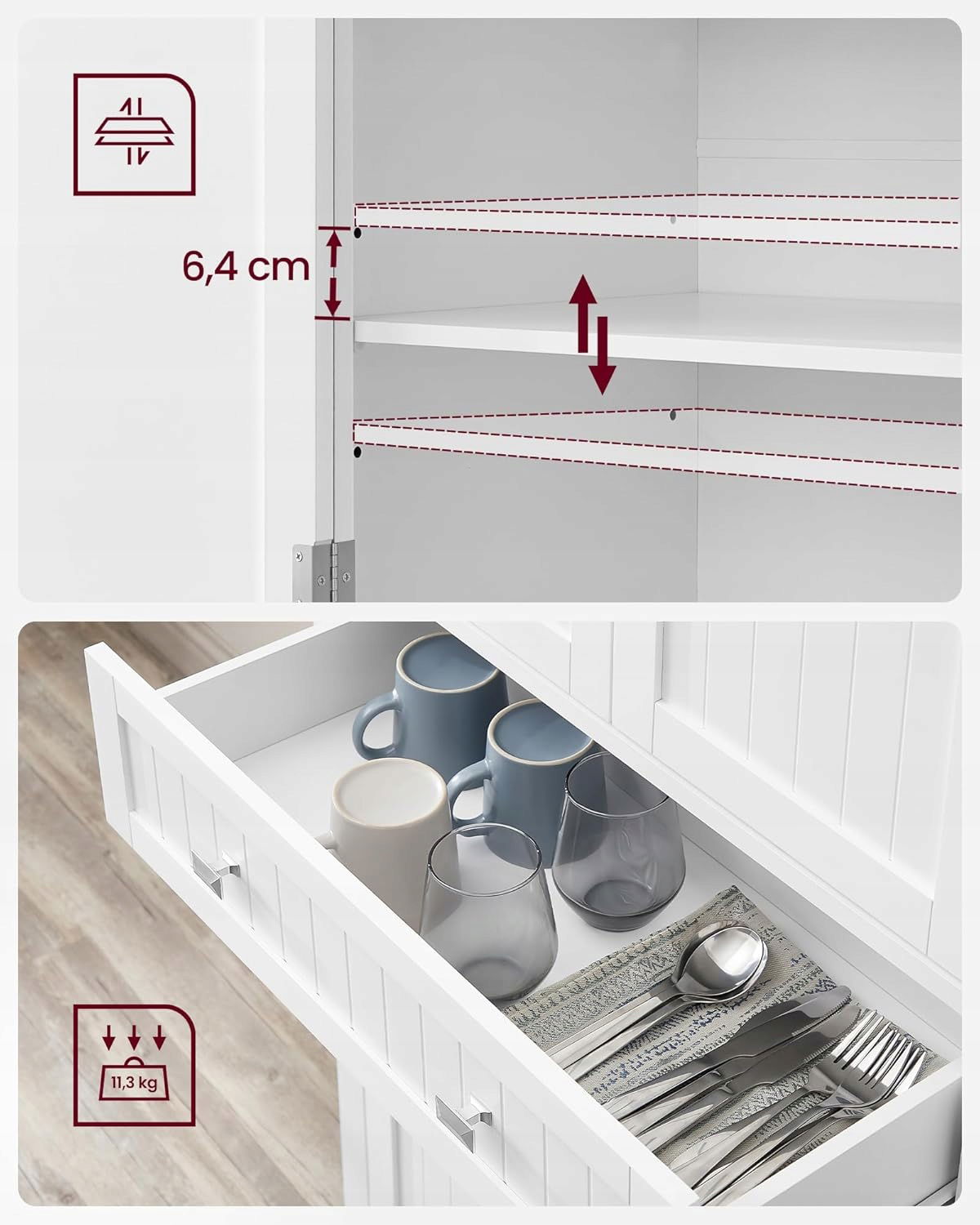 - Elastyczne półki: ta komoda ma 4 regulowane półki, które można ustawić na 3 różnych wysokościach i które mogą utrzymać do 27 kg. Dzięki temu w tej szafce można łatwo przechowywać nawet wysokie urządzenia kuchenne.