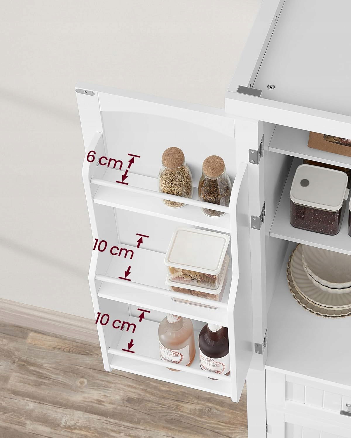 - 6 przegródek na drzwiach: dwie o głębokości 6 cm i cztery o głębokości 10 cm, każda przegroda wytrzymuje do 4,5 kg, co pozwala wykorzystać przestrzeń w górnej szafce. Nadają się do przejrzystego przechowywania przypraw i oliwy z oliwek