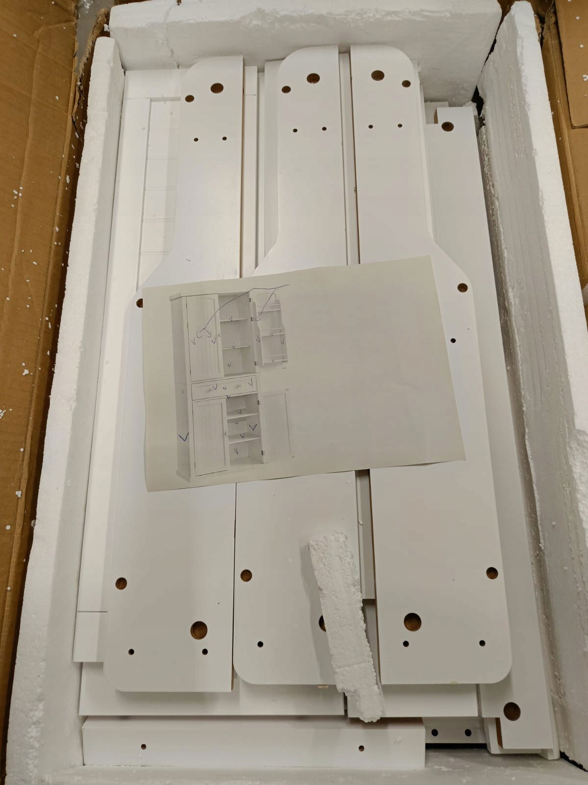 STAN: Szafka niekompletna. Aby złożyć szafę powinny być dwa pudełka, my posiadamy 1 z 2 części. Na ostatnich zdjęciach w galerii, mniej więcej oznaczone co jest w tym zestawie. Brak śrub montażowych, zawiasów , górnego korpusu szafki i wszystkich drzwiczek. Może komuś się przyda.