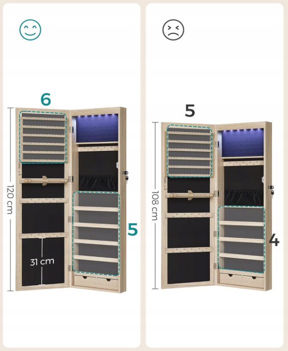 - ✴️Drzwi czy ściana? Szafkę z lustrem wystarczy zawiesić na futrynie drzwi sypialni lub łazienki za pomocą dołączonych haczyków. Oczywiście szafkę na biżuterię można również przymocować do masywnej ściany za pomocą dołączonych śrub