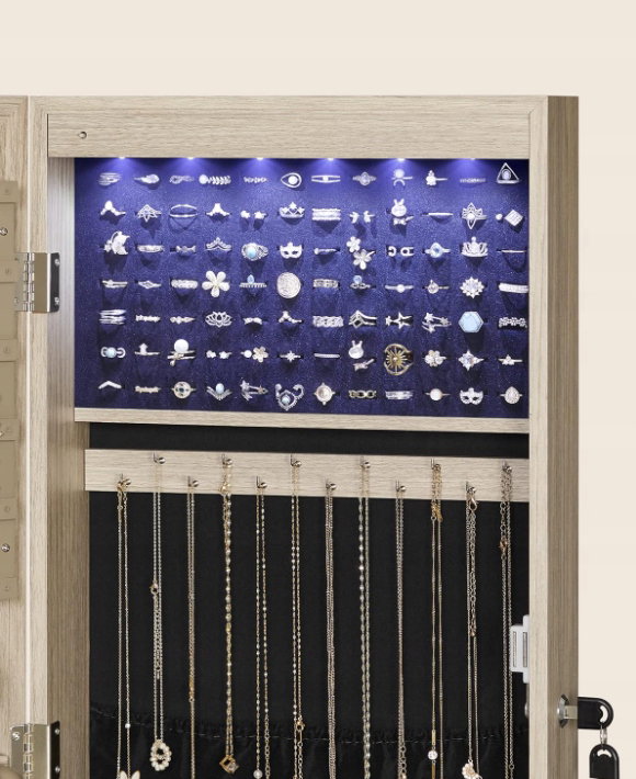 - ✴️Błyszczące i błyszczące: po długim dniu pracy zdejmij biżuterię i przechowuj ją w tej szafce wiszącej 84 uchwyty na pierścionki, 90 miejsc na kolczyki, 48 otworów na kolczyki, 32 haczyki na łańcuszki, 5 poziomów, 2 szuflady i 1 drążek na bransoletkę