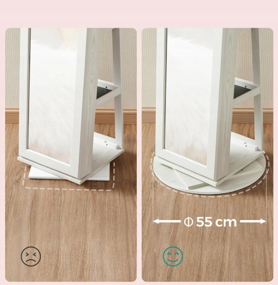 - ✴️Obrót o 360 °: dzięki funkcji obracania możesz uzyskać dostęp do często używanych przedmiotów pod dowolnym kątem. Podstawa o średnicy 55 cm zapewnia stabilne trzymanie. Szafka na biżuterię z lustrem składa się w kilka minut