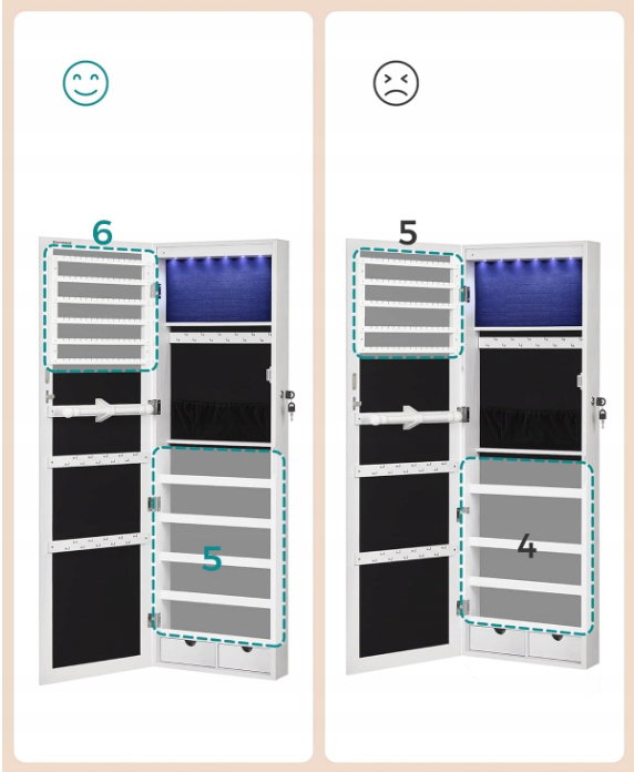 - ✴️Zachowaj prostotę: Wystarczy zawiesić tę szafkę z lustrem na ramie drzwi w sypialni lub łazience za pomocą dołączonych haczyków. Oczywiście można również przymocować szafkę na biżuterię do solidnej ściany za pomocą dołączonych śrub.