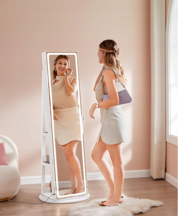 - ✴️[Pełnowymiarowe lustro z oświetleniem LED] Ta szafka na biżuterię wyposażona jest w pełnowymiarowe lustro z 3 poziomami jasności i funkcją pamięci. Dotykowe sterowanie pozwala wybrać odpowiednie oświetlenie, dzięki czemu możesz dokładniej sprawdzić swój wygląd