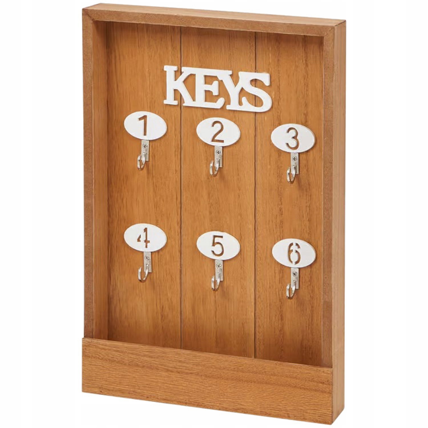 Ładna drewniana szafka na klucze z napisem Home oraz 6 ponumerowanymi haczykami. W ten sposób Twoje klucze są bezpiecznie przechowywane i zawsze możesz je znaleźć.