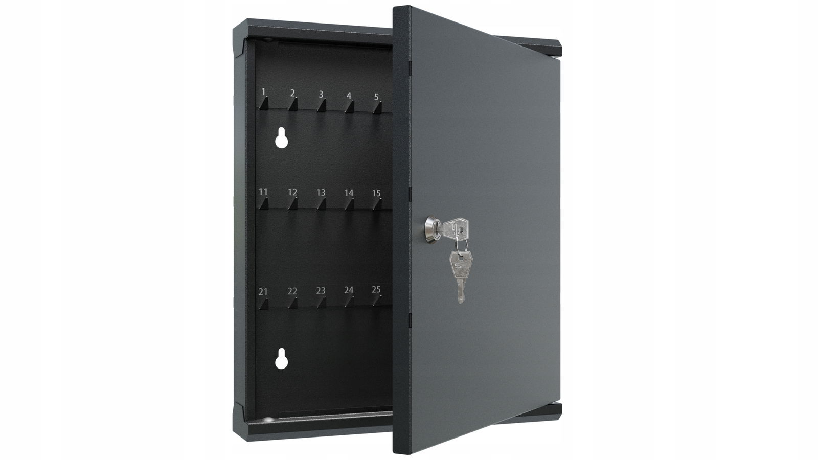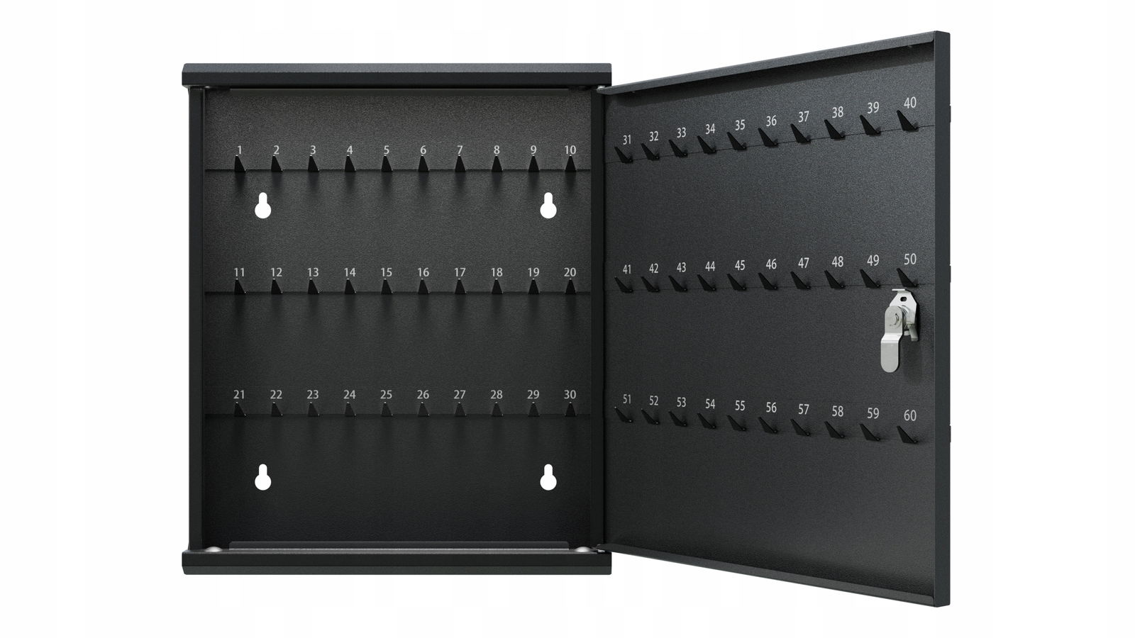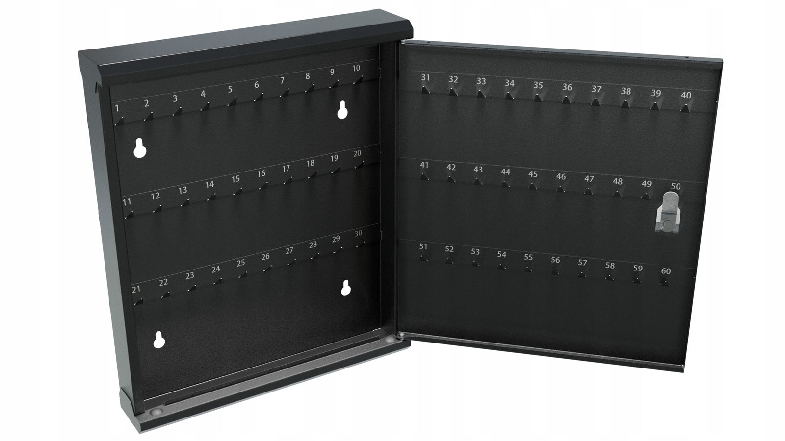Praktyczna i solidna szafka na klucze wykonana z metalu, wyposażona w 60 numerowanych haczyków. Idealna do biur, warsztatów, hoteli czy innych miejsc wymagających bezpiecznego przechowywania wielu kompletów kluczy.