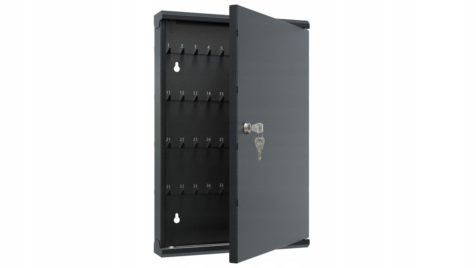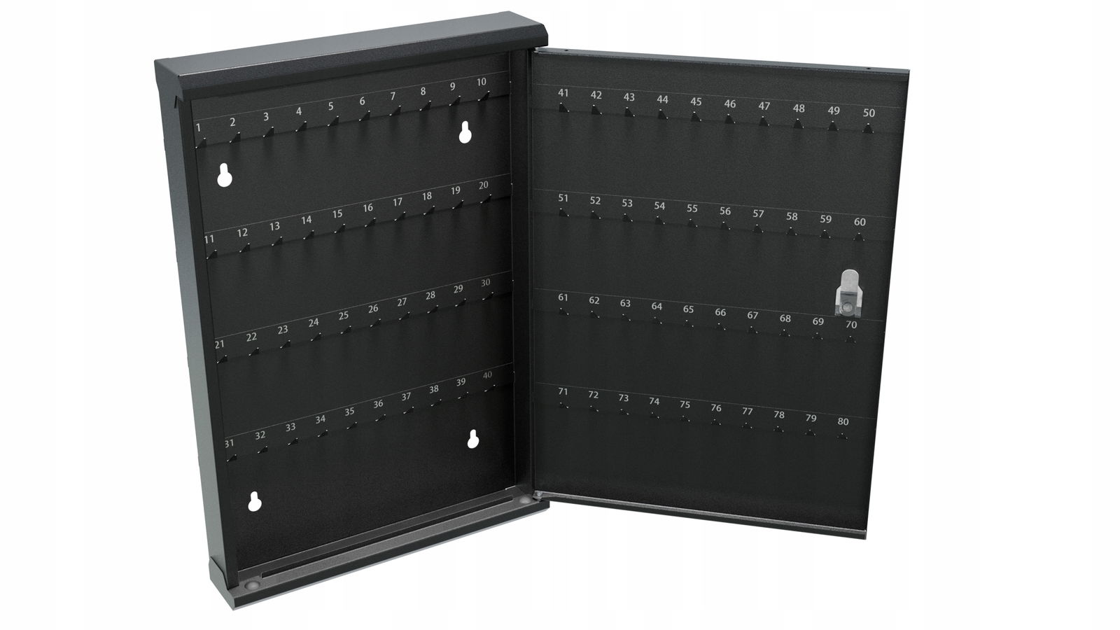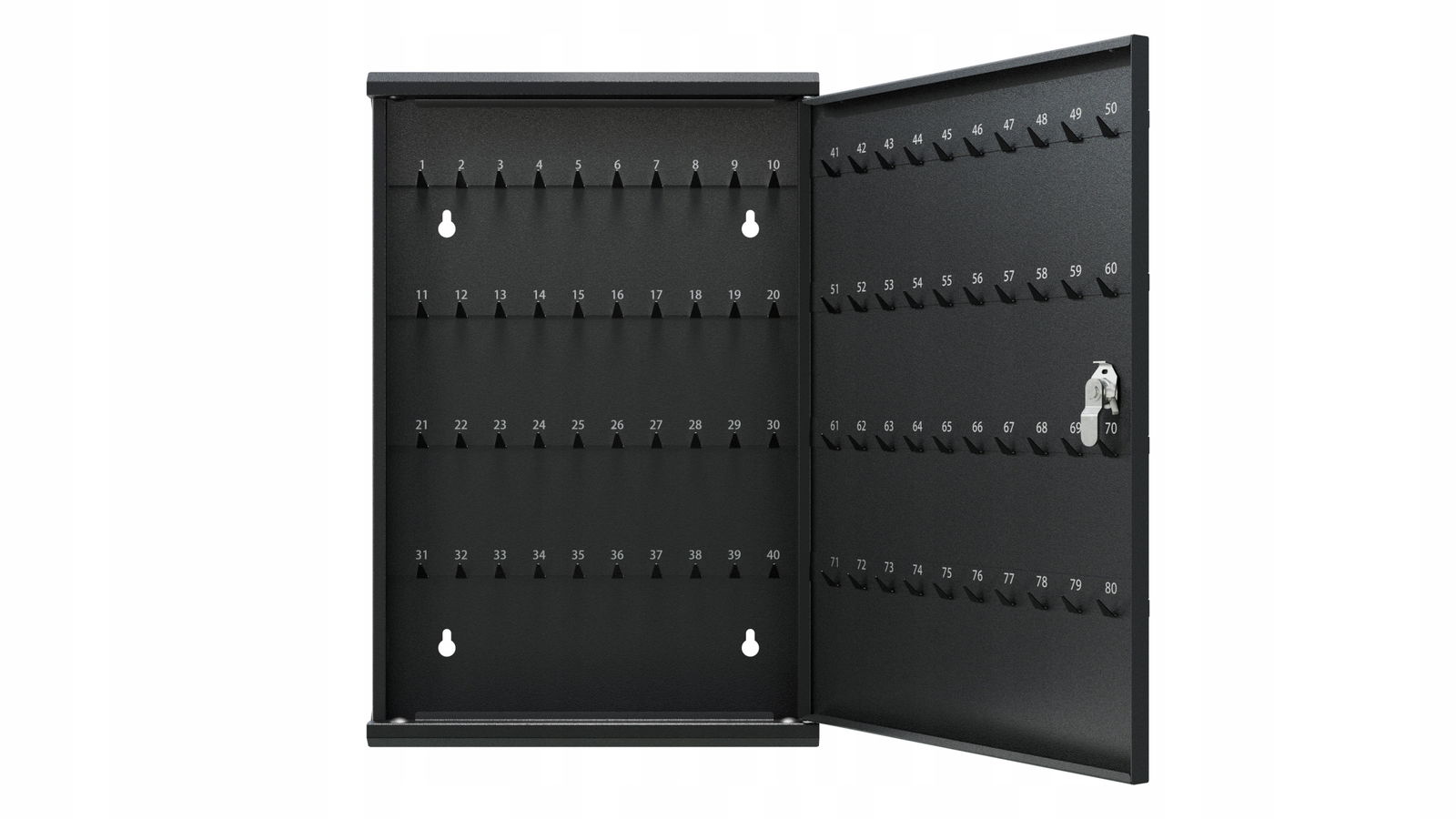 Praktyczna i solidna szafka na klucze wykonana z metalu, wyposażona w 80 numerowanych haczyków. Idealna do biur, warsztatów, hoteli czy innych miejsc wymagających bezpiecznego przechowywania wielu kompletów kluczy.