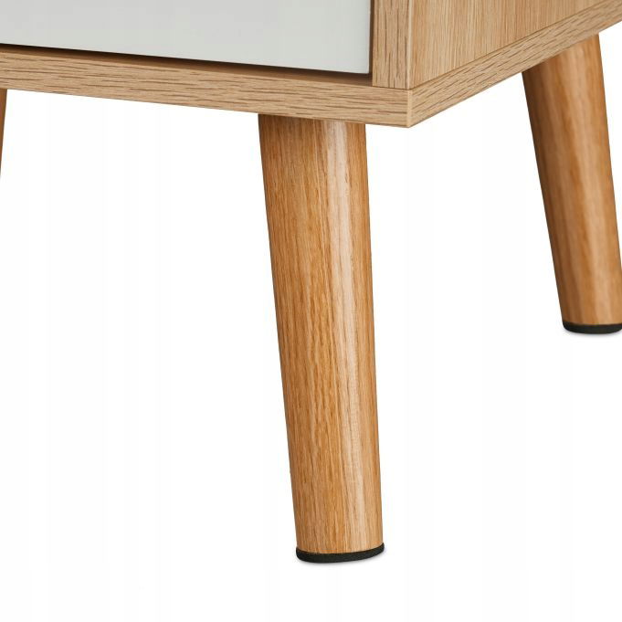 - Wysoka Jakość Wykonania: Solidna konstrukcja z trwałych materiałów zapewnia stabilność i długowieczność mebla. Szafka jest łatwa w montażu i czyszczeniu, co sprawia, że jest to inwestycja na lata. Nóżki z naturalnego drewna dodają lekkości i eleganckiego, skandynawskiego charakteru.