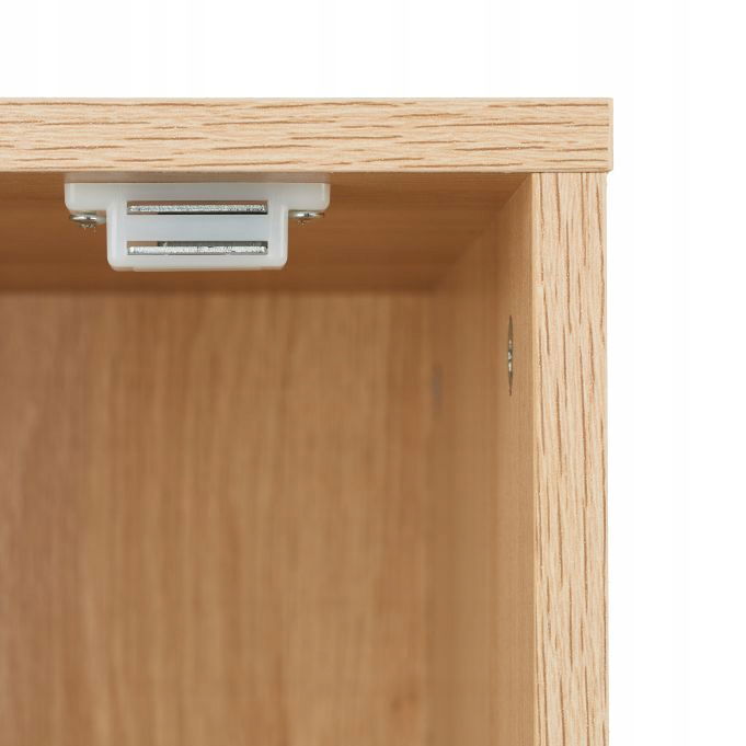 - Kolor: Jasne drewno (dąb sonoma/buk) z białymi drzwiczkami.