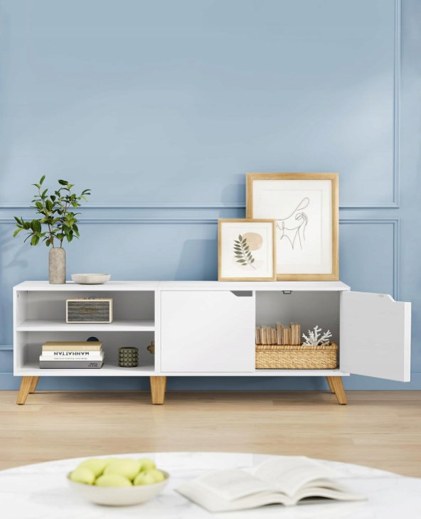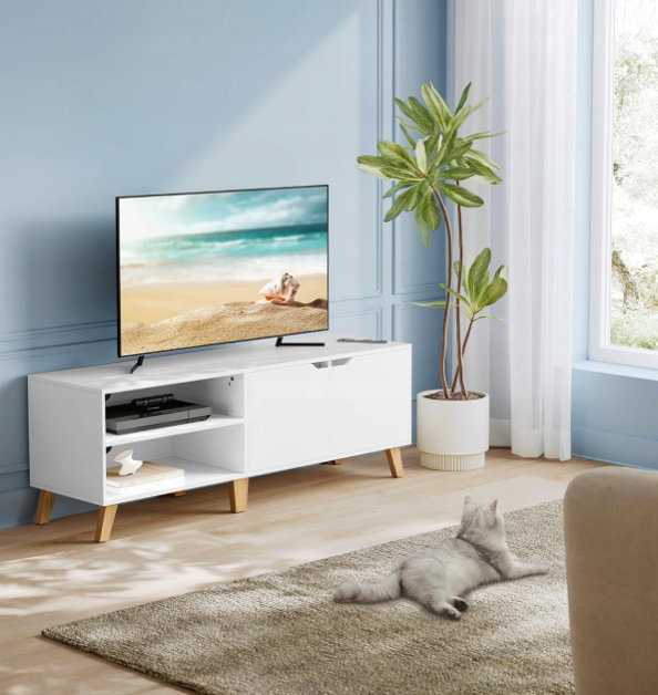 - ✴️3, 2, 1, akcja: ten nowoczesny mebel pod telewizor będzie Twoim idealnym towarzyszem w niedzielny wieczór. Chwyć chipsy ukryte za drzwiami otwieranymi zatrzaskami i ciesz się wieczorem filmowym z rodziną lub przyjaciółmi.