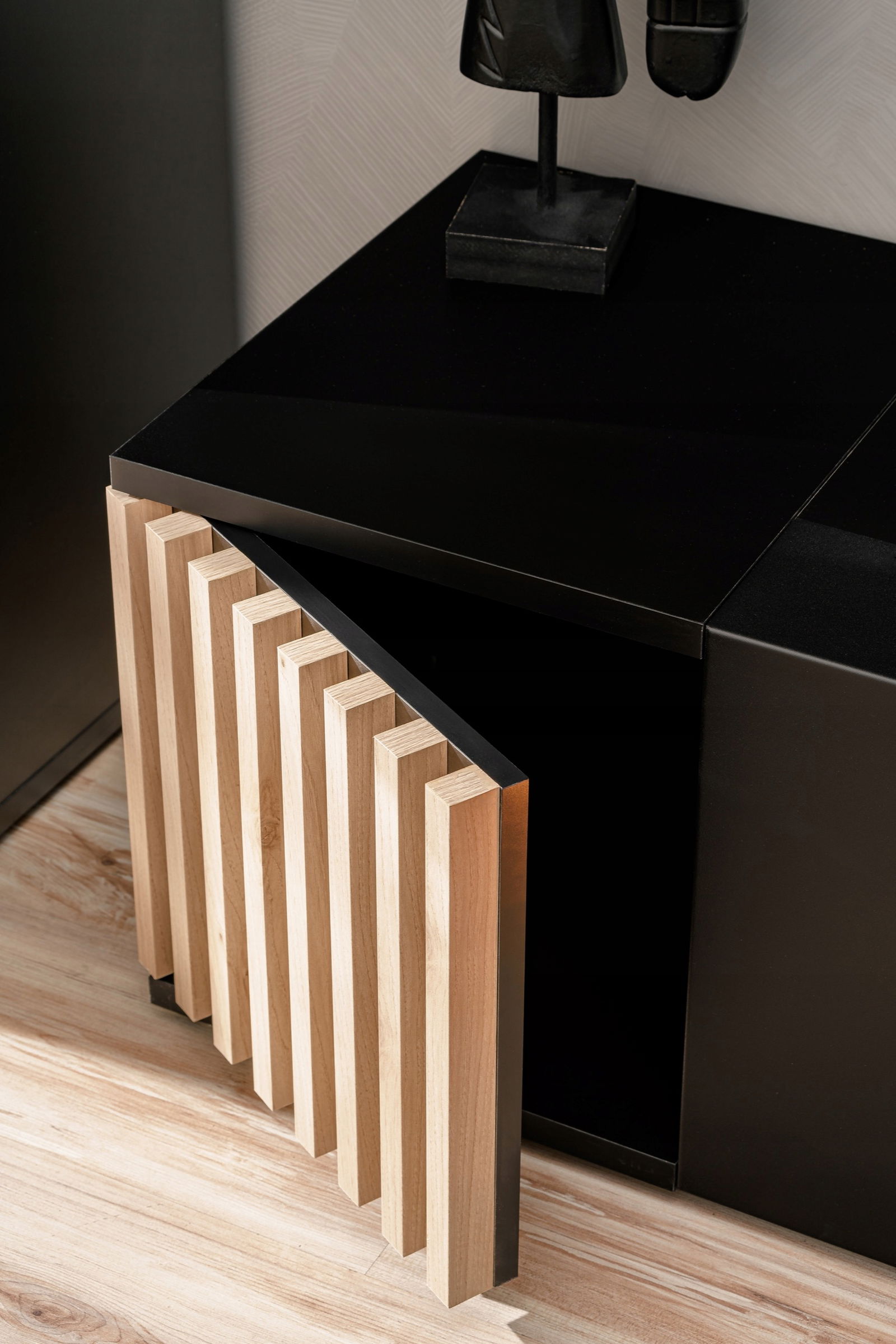 Meble CAMERON to elegancja w nowoczesnym wydaniu. Czarne, matowe korpusy przełamane naturalnymi lamelami w kolorze Hickory Jackson nadają wnętrzu wyrazistości i ciepła. Idealne do aranżacji nowoczesnych, industrialnych oraz loftowych przestrzeni.