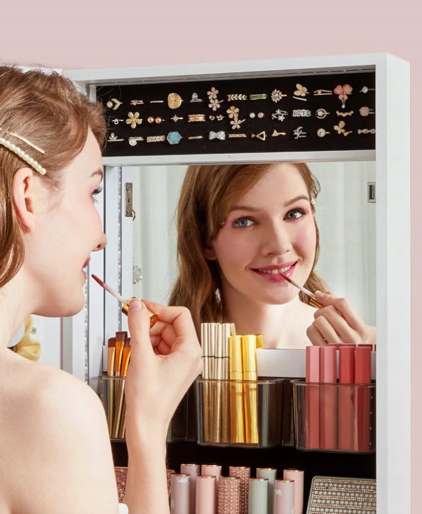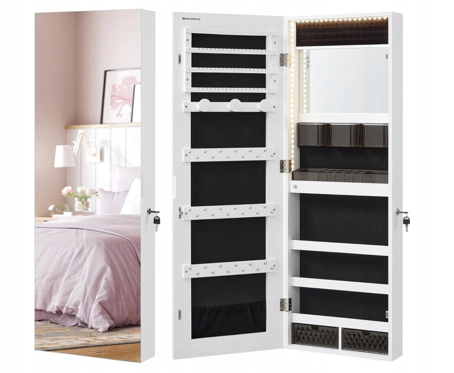 - ✴️Podświetlane lustro wewnętrzne, bardzo praktyczne: Po otwarciu drzwi szafki na biżuterię zaświecą się diody LED. Tak praktyczne, aby zrobić makijaż i umieścić biżuterię przed wewnętrznym lustrem