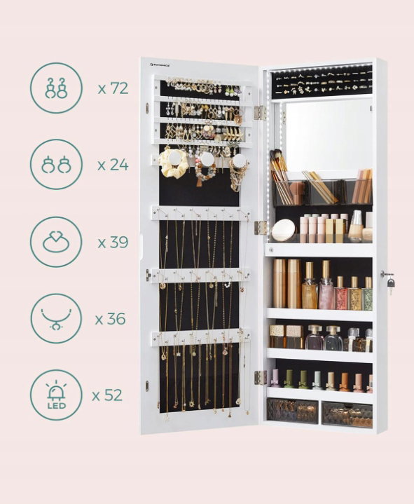 - ✴️2 w 1 szafka i lustro – 26 haczyków na naszyjniki, 3 drążki na bransoletki, 72 miejsca na kolczyki, 24 miejsca na kolczyki, 39 miejsc na pierścionki, 3 półki i 2 szuflady. Lustro pozwala patrzeć na siebie od stóp do głów