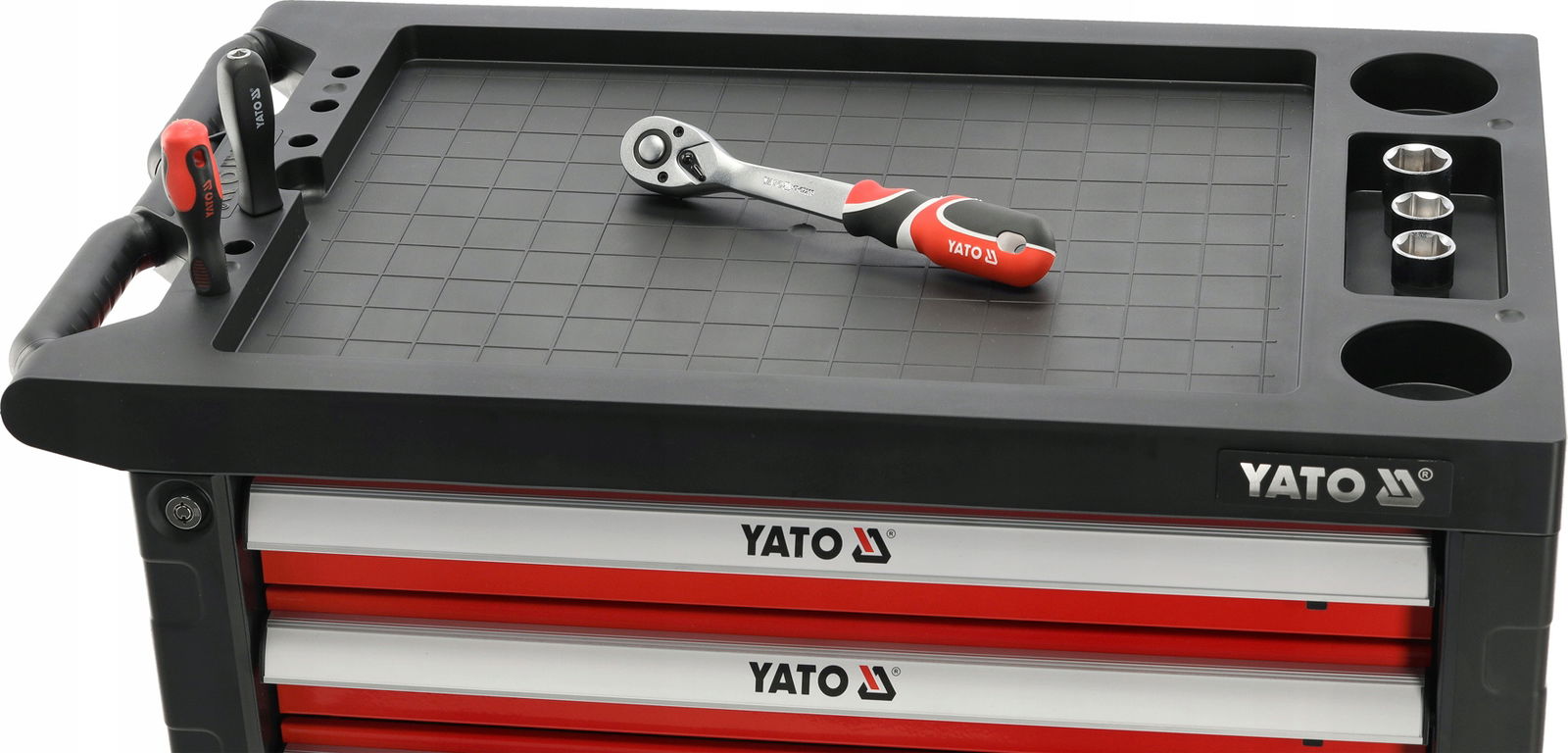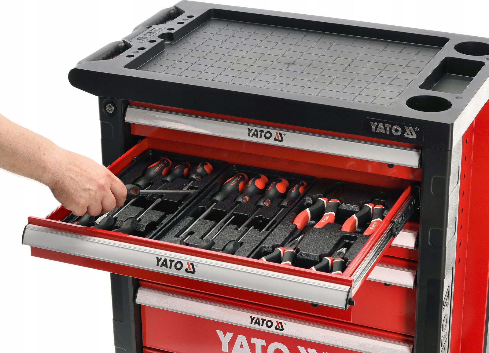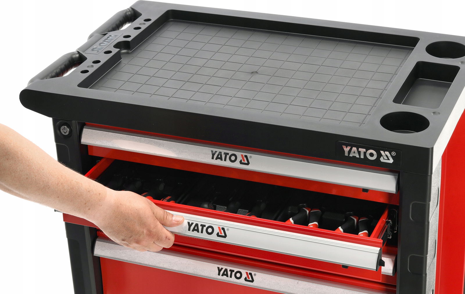 Profile wykonane są z podwójnej blachy stalowej. Szafka warsztatowa posiada narożne odbojniki, które chronią przed przypadkowym uszkodzeniem, np. karoserii samochodu. Atuty to także antypoślizgowy blat roboczy, gumowe koła 125 mm, w tym 2 z hamulcem, uniwersalna perforacja ścian, podwójne ściany.