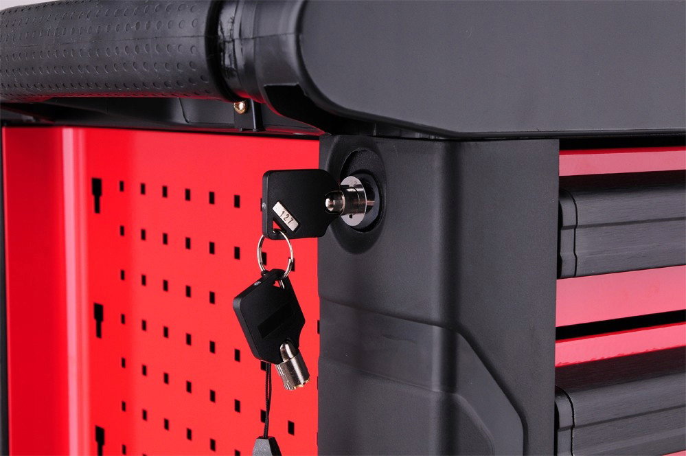 Szafka warsztatowa posiada narożniki odbojniki, które chronią przed przypadkowym uszkodzeniem, np. karoserii samochodu. Blat wykonany z polipropylenu wytrzymuje obciążenie 430 kg.