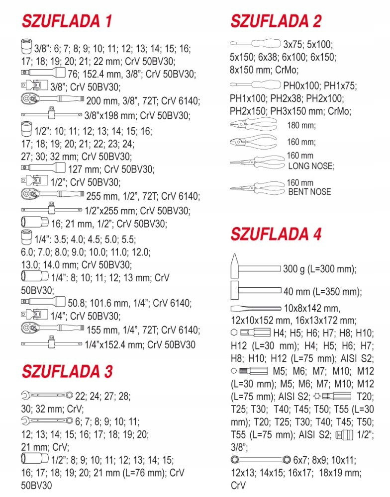 - Nasadki wykonane ze stali CrV 50BV30, akcesoria ze stali CrV 6140, bity wykonane ze stali S2.