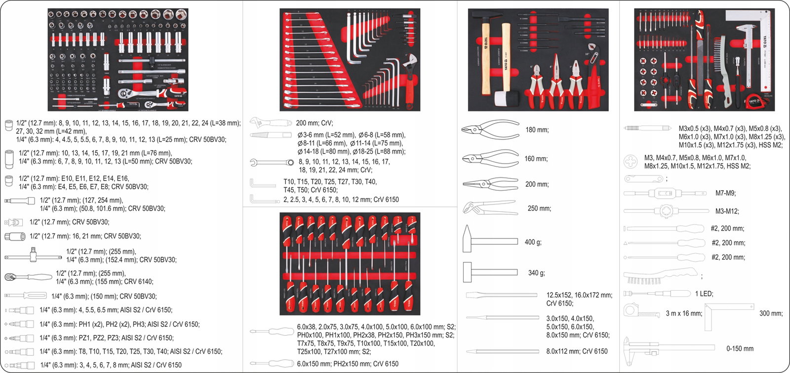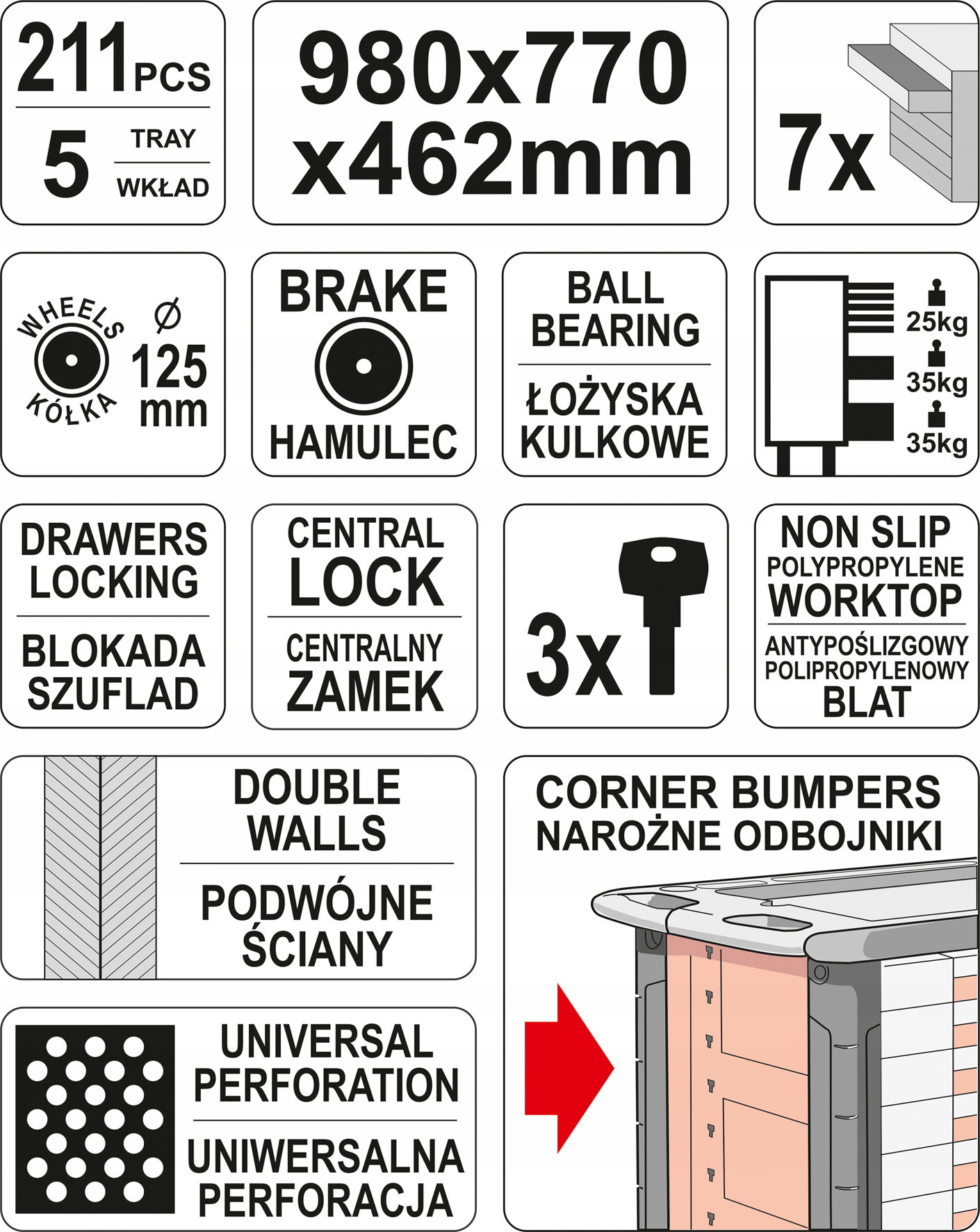 5 górnych szuflad zawiera 211 starannie dobranych narzędzi